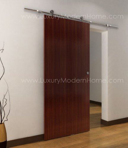 Modern otthonbelső faajtóval és egy fa kézzel rajzolt vázlatával. A szoba fapadlós, bal oldalán egy kis cserepes növény található. A falon egy szöveges fedvény található, amelyen a „LUXURYMODERNHOME.COM” felirat olvasható.