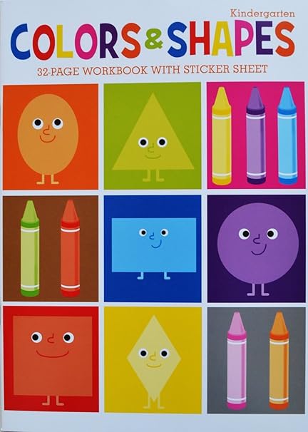 A colorful children's book titled 'Colors & Shapes' with a sticker sheet on the back cover. The sticker sheet features various shapes and colors, including a large purple circle, a yellow triangle, a blue square, and a pink heart, among others. The shapes are surrounded by colorful borders and have cute, cartoon-like faces.