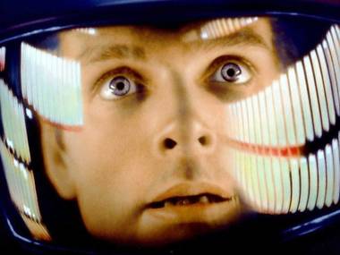 The first image depicts a close-up of a person's face with a look of surprise or shock. The person is wearing a helmet with a reflective visor, which is reflecting a complex pattern of lines and shapes. The visor is partially obscuring the person's face, but their eyes are visible and appear wide open. The overall tone of the image is dark with a focus on the contrast between the person's face and the reflective visor.