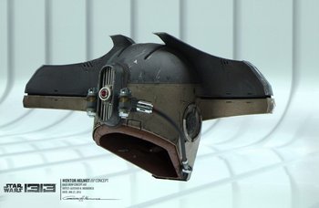 A detailed illustration of a Stormtrooper helmet with a weathered and aged appearance, featuring a metallic texture with visible wear and tear, set against a white background with a Star Wars logo and copyright information at the bottom.