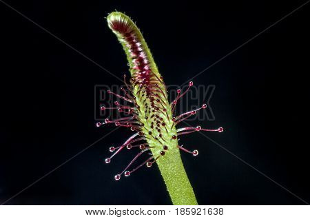 A close-up image of a green plant with a prominent, elongated, red and green flower-like structure in the center. The flower has a cluster of small, red-tipped stamens and is surrounded by numerous small, round, dew-covered buds. The background is dark, and the image has a watermark with the text 'BIGSTOCK' and a logo.