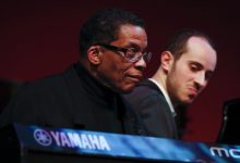 Egy szemüveges férfi ül a zongoránál, fekete inget és fekete öltönykabátot visel. Enyhe mosollyal balra néz. A zongora elején Yamaha logó látható, a háttérben pedig egy másik személy elmosódott alakja látható.