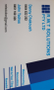 A close-up view of a white business card with blue text and a blue and white logo at the top right corner. The card has a blue and white striped border at the bottom.