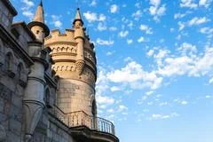 A tall, ornate castle with multiple spires and a balcony is set against a backdrop of a blue sky with scattered clouds.