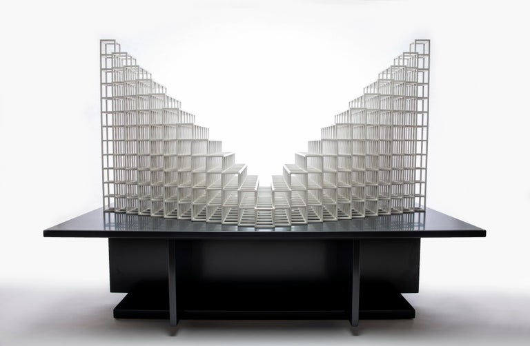 The image showcases a modern piece of furniture, specifically a black table with a unique design element on top. The design element consists of multiple white geometric structures resembling shelves or boxes, which are arranged in a stepped pattern. These structures are made up of smaller white boxes or shelves, creati... | |