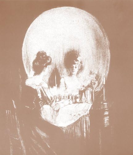 The image portrays a surreal scene featuring two women engaged in what appears to be a tea party or reading session. The woman on the left is seated at a table with a book open before her, suggesting she might be reading or studying. She has long hair and is wearing a dress with a high collar, which could be indicative of a historical or fantasy setting. The woman on the right stands behind her, holding what seems to be a teapot or a similar object, possibly indicating her role as a host or caretaker. Both women are positioned within a large circular frame or mirror, which adds a dreamlike quality to the scene. The mirror's reflection shows the woman on the right as well, creating a sense of symmetry or duplication. The background is dark with hints of architectural features like a window or door frame, contributing to the indoor setting. The overall atmosphere is one of quiet contemplation or intimate conversation.