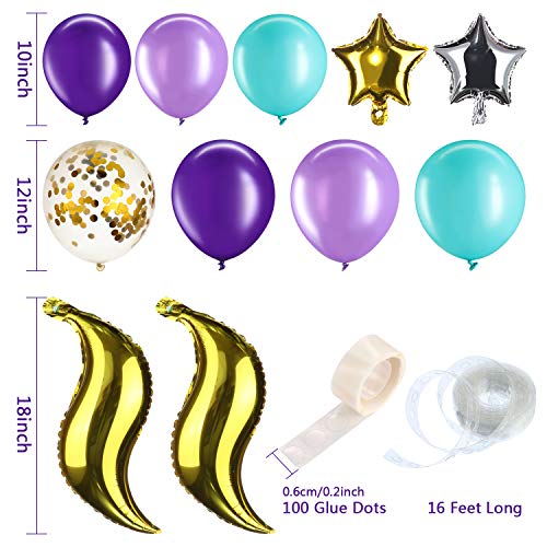 The image displays a collection of balloons and decorative items against a white background. There are three types of balloons: regular round balloons, star-shaped balloons, and elongated balloons resembling bananas. The regular round balloons come in three colors: purple, blue, and gold. The star-shaped balloons are also available in three colors: gold, silver, and black. The elongated balloons are gold in color. Additionally, there are two rolls of string or ribbon, one clear and one white, with measurements indicating their length. The clear roll measures 18 inches long, while the white roll measures 16 feet long. The gold elongated balloons are 18 inches long as well. The image also includes text providing measurements for the balloons and string: 0.6 cm/0.21 inches for the gold elongated balloons, 100 glue dots for the star-shaped balloons, and 16 feet long for the white roll of string.