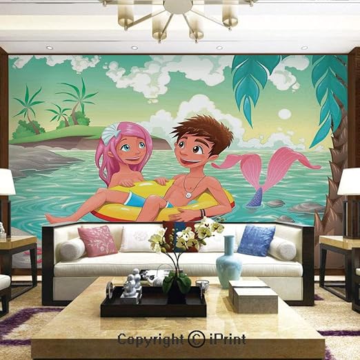 The image presents a vibrant living room scene with a large wall mural as its centerpiece. The mural depicts two animated characters: a boy with brown hair wearing blue shorts and a girl with pink hair wearing a white dress with blue accents. They are seated on a yellow inflatable ring with pink fins on either side. The background of the mural showcases a tropical beach scene with palm trees, blue water, and pink flamingos. The living room itself features a white sofa adorned with blue and pink throw pillows, accompanied by a wooden coffee table holding a vase with white flowers. A purple area rug with geometric patterns covers the floor, adding a pop of color to the room. The overall atmosphere suggests a playful and cheerful environment.
