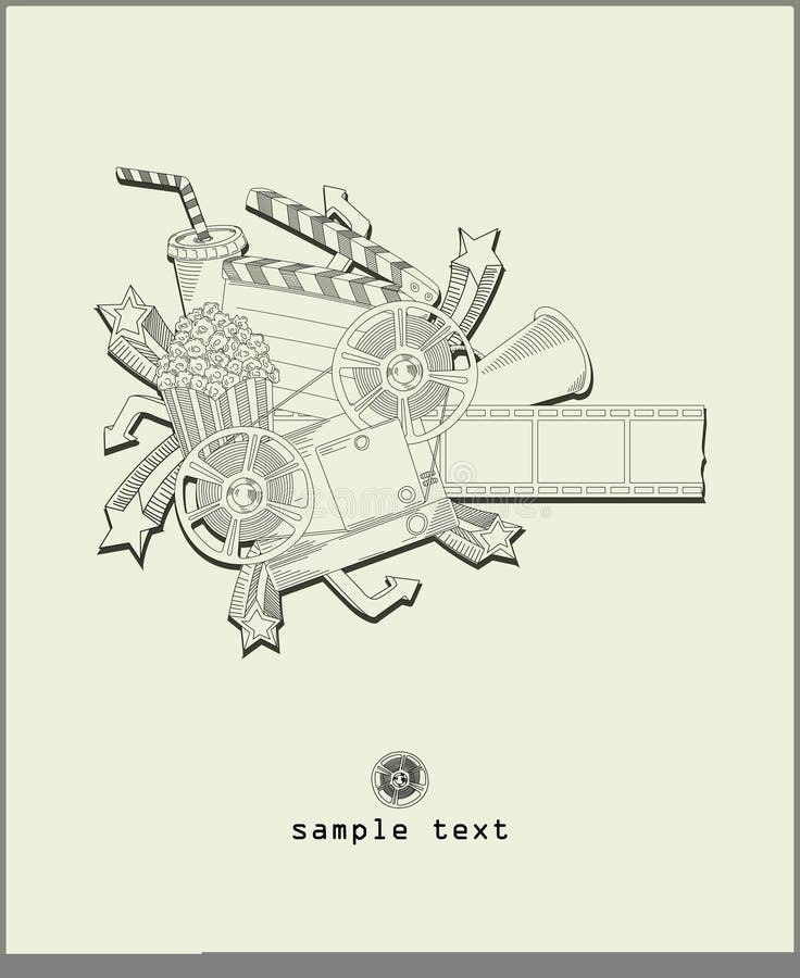 The image presents a whimsical illustration featuring various objects that are intertwined or stacked on top of each other. At the center, there's a large film reel with multiple smaller film reels attached to it. The film reels are interspersed with other objects such as a camera, a clapperboard, and what appears to be a microphone or speaker. There are also several stars scattered throughout the scene, adding a touch of whimsy. The objects are arranged in such a way that they seem to be part of a larger structure or machine, possibly suggesting a theme related to filmmaking or media production. The illustration has a playful and creative feel to it, with each object contributing to the overall narrative of the scene.