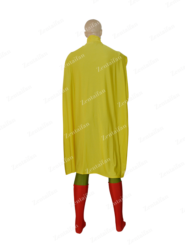 The image showcases a mannequin dressed in a vibrant yellow coat with a high collar, paired with red leggings or tights. The mannequin stands against a plain white background, which accentuates the bright colors of its attire. The mannequin's pose is neutral, with its back facing the viewer, allowing for a clear view of its outfit. The coat's length extends past the waist, suggesting it could be worn over other clothing items or as a standalone piece for colder weather. The red leggings add a contrasting pop of color to the ensemble. The overall style of the mannequin's attire suggests a casual or sporty fashion aesthetic.