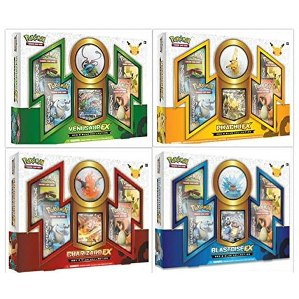 The image displays four Pokémon Trading Card Game (TCG) box sets, each featuring a different Pokémon character prominently on the cover: Pikachu, Charizard, Blastoise, and Venusaur. Each box set has a unique color scheme: Pikachu's box is yellow with blue accents; Charizard's box is red with yellow accents; Blastoise's box is blue with red accents; and Venusaur's box is green with yellow accents. The boxes are designed with a three-dimensional effect, giving them depth and making them stand out from the flat surface they are placed on. The Pokémon characters are depicted in dynamic poses, suggesting action or battle readiness. The box sets are likely collector's items or special edition releases, given their distinct designs and the inclusion of popular Pokémon characters.