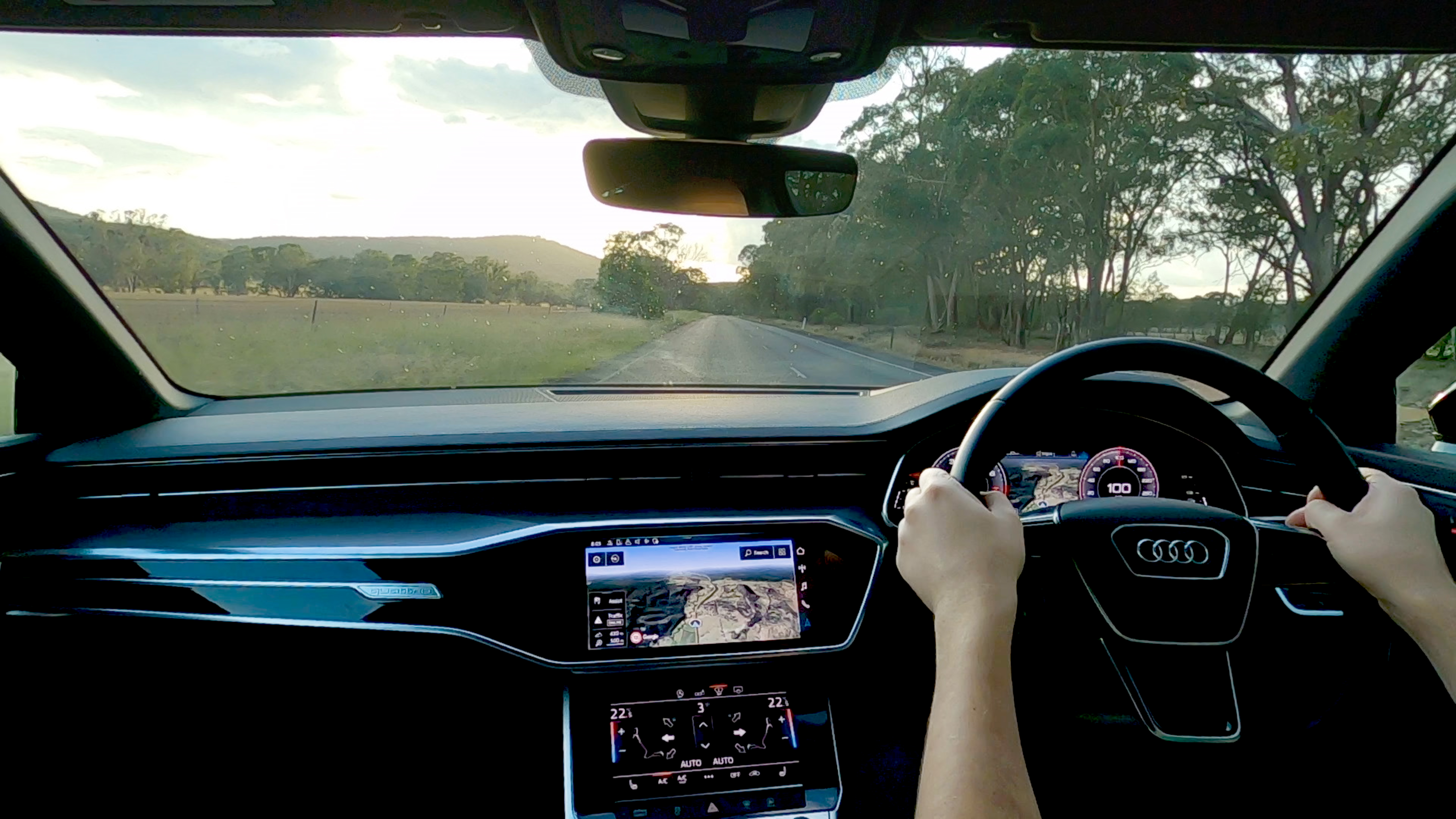 The image captures the interior view from inside a car during a drive. The dashboard features a digital display showing the car's speedometer and navigation system. The steering wheel has a logo on it, indicating the make of the vehicle. The driver's hands are on the steering wheel, suggesting they are actively driving. The car's interior is well-lit with ambient lighting. Through the windshield, we can see a rural landscape with trees lining the road ahead. The sky is overcast with clouds, suggesting it might be early morning or late afternoon. The road appears to be empty, with no other vehicles or pedestrians visible. The overall scene suggests a peaceful drive through a countryside setting.