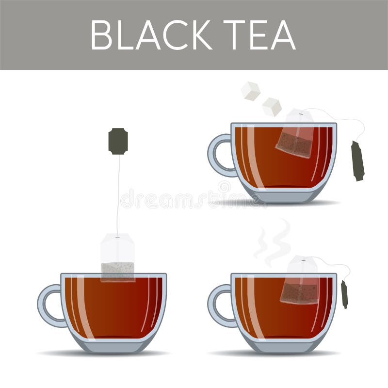 The image presents three distinct scenes related to black tea. In the first scene at the top left, there's a cup of black tea with a teabag floating on top. The second scene at the top right shows another cup of black tea with steam rising from it, indicating it's hot. The third scene at the bottom left features a teabag suspended above a cup of black tea, ready to be steeped. The background is plain white, emphasizing the tea scenes.