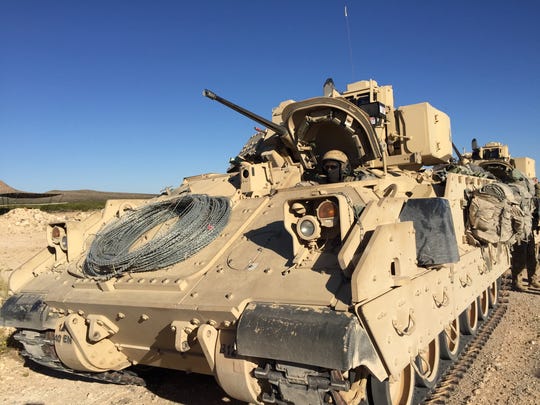 The image captures a scene featuring two military vehicles parked on a dirt road under a clear blue sky. The vehicle in the foreground is a tan armored personnel carrier (APC) with a large gun turret on top, equipped with what appears to be a heavy machine gun or cannon. The APC has visible tracks for movement and is adorned with various pieces of equipment, including what looks like a wire spool on top. The vehicle's design suggests it's designed for combat or military operations. In the background, there's another similar APC, also tan with a gun turret, parked further down the road. The environment around them includes sparse vegetation and rocky terrain, indicative of a desert or arid region. There are no people or other significant objects in the immediate vicinity of the vehicles.