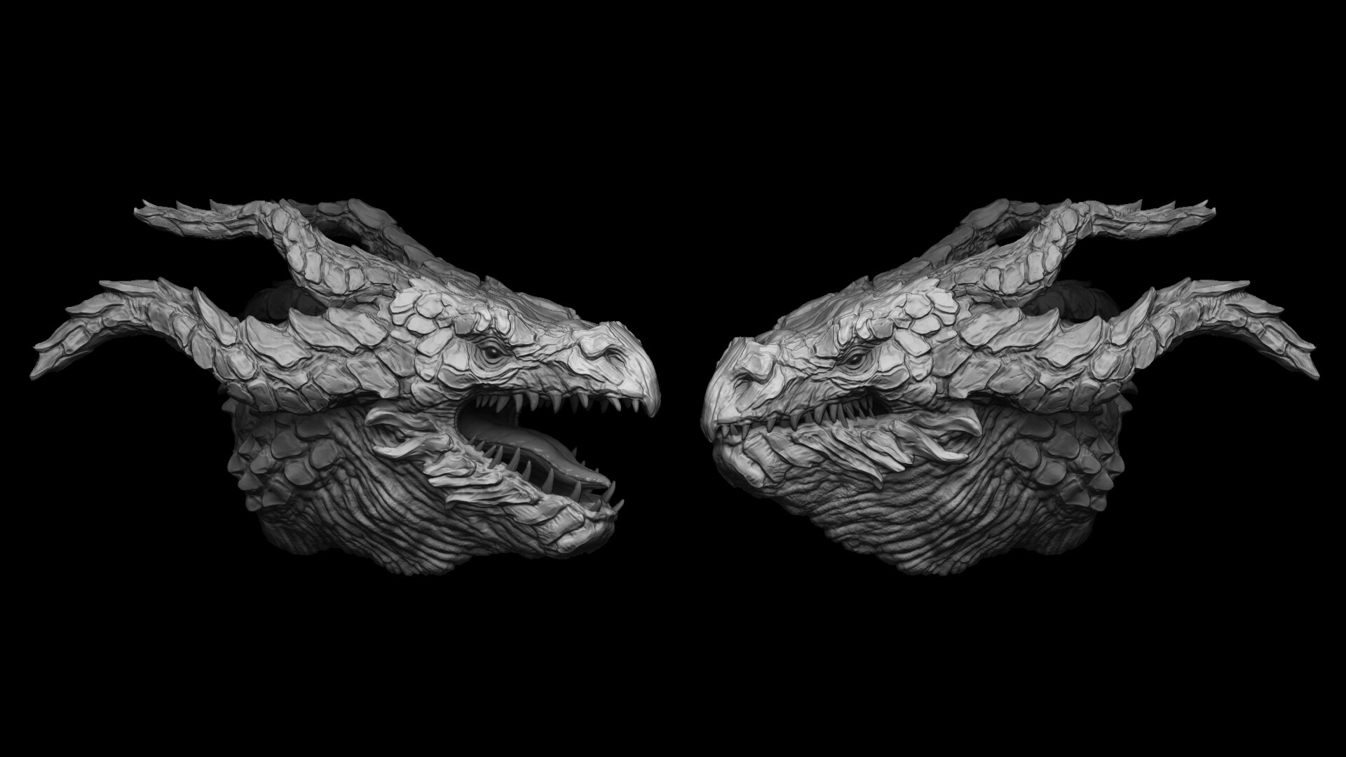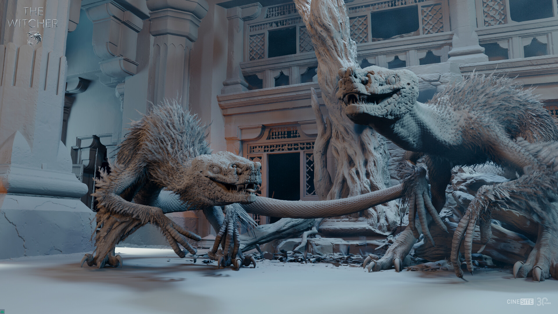 xYv2vm | 47,553,635 | cinesite | 3,840 | 2,160 | 2022-03-21 | 52 | The Witcher season 2: Basilisk Visual Development Case Study - Greyshade render showing the displaced geometry and untextured groom. | 3d, ambiguous feral, detailed, duo, fur, mythological basilisk, scales, the witcher, unfinished, zbrush | |