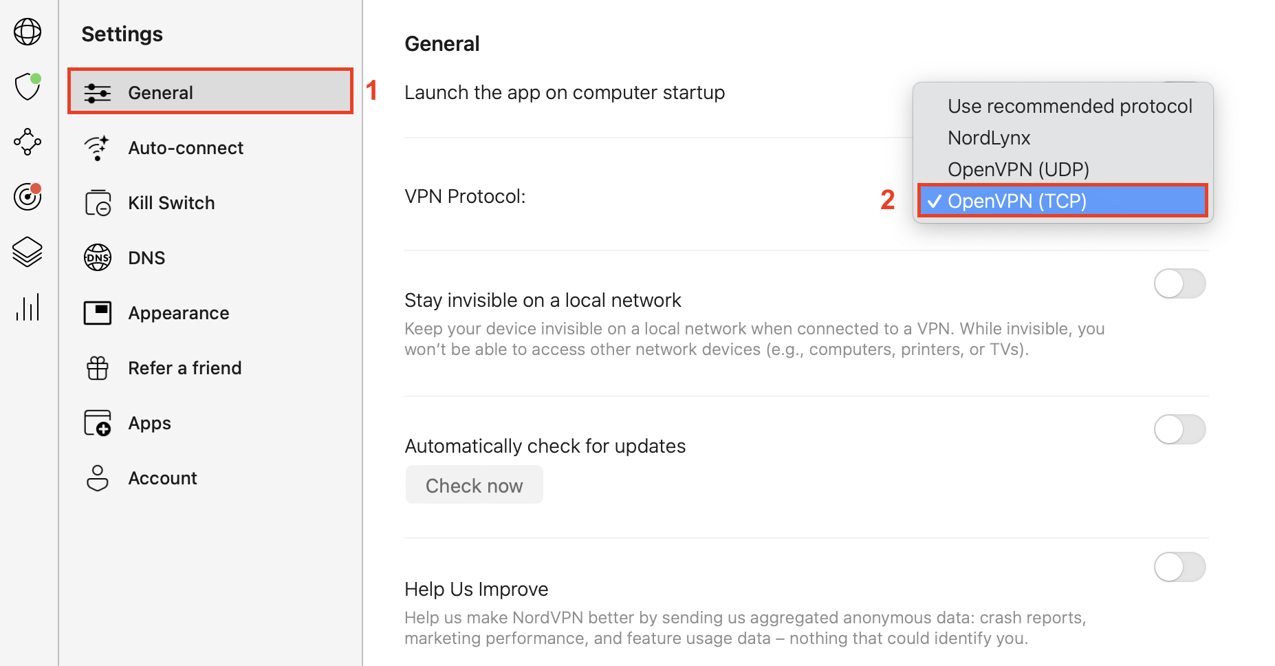 4. Select the OpenVPN (UDP) or OpenVPN (TCP) option.",https://support.nordvpn.com/hc/en-us/related/click?data=BAh7CjobZGVzdGluYXRpb25fYXJ0aWNsZV9pZGwrCBGougqdEjoYcmVmZXJyZXJfYXJ0aWNsZV9pZGwrCBF8VPDrFjoLbG9jYWxlSSIKZW4tdXMGOgZFVDoIdXJsSSJTL2hjL2VuLXVzL2FydGljbGVzLzIwNDY1Njk5MTcwMzIxLVN3aXRjaGluZy1wcm90b2NvbC10by1PcGVuVlBOLVVEUC1vci1UQ1AtaU9TBjsIVDoJcmFua2kH--88ff94752793d7d3547da087ee71bf4436751dd3