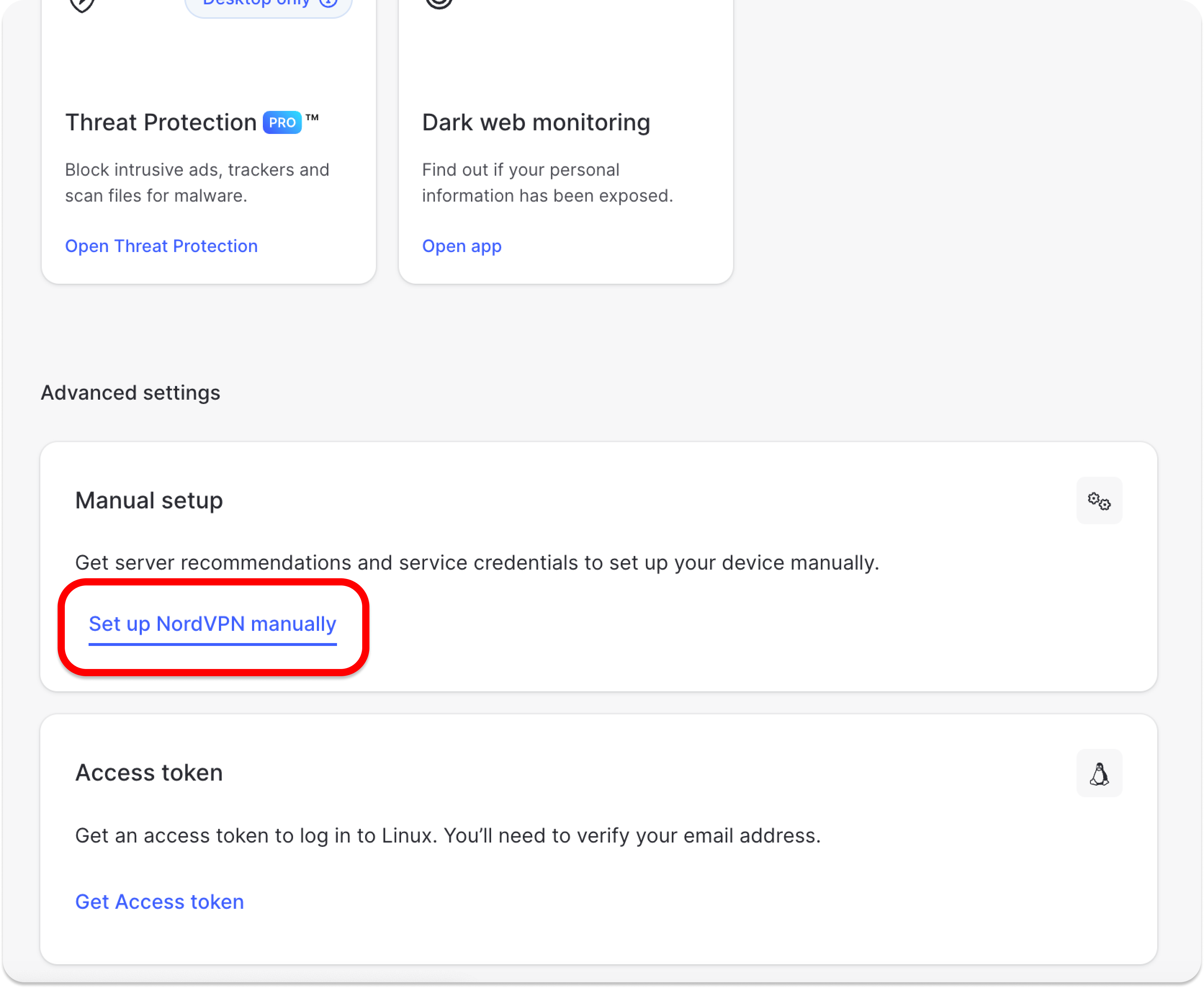 2. Scroll down to Advanced Settings and click Set up NordVPN manually.