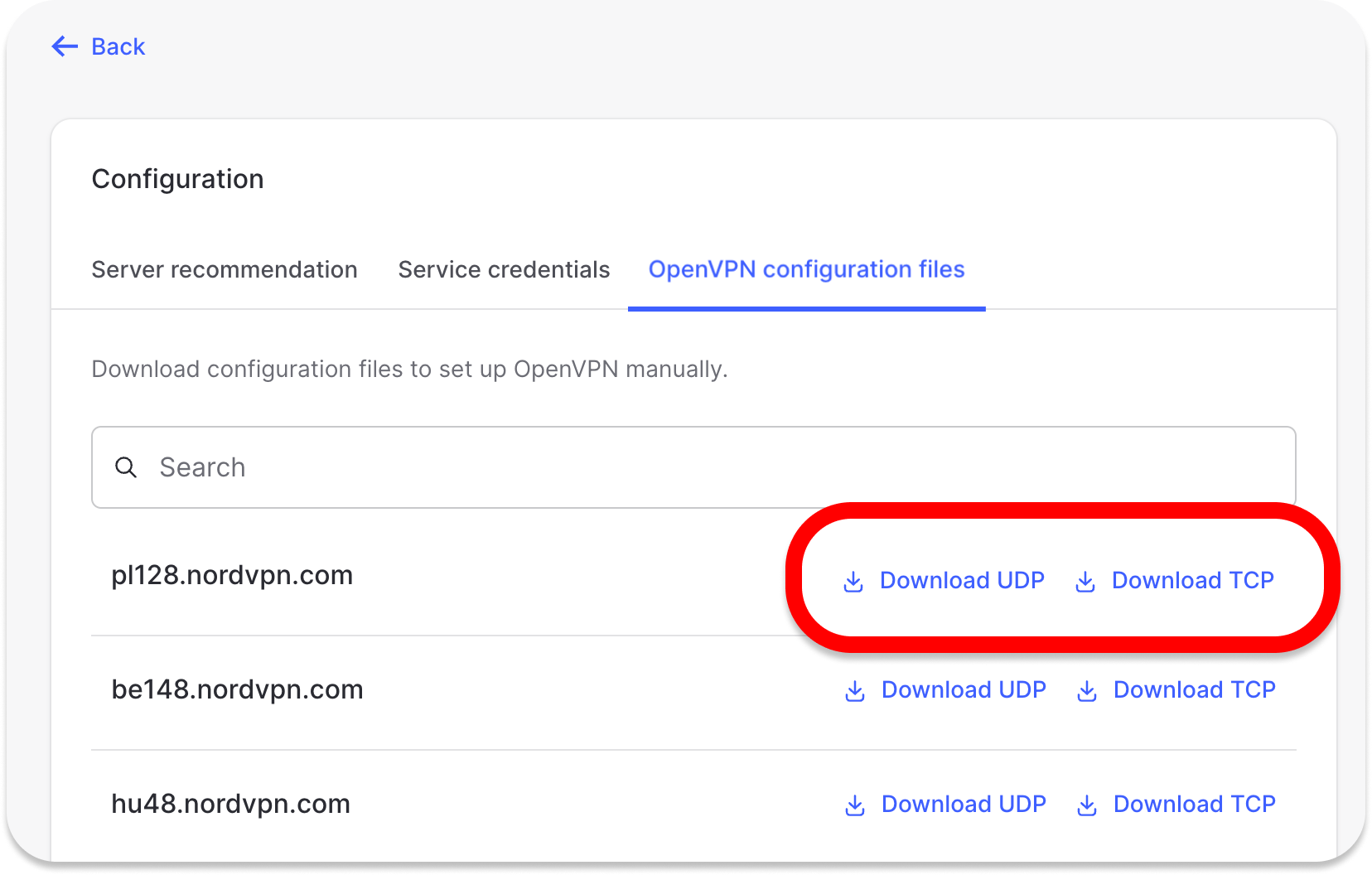 2. Find the server you wish to connect to by using the Search bar or by scrolling down and download it by clicking Download UDP or Download TCP.