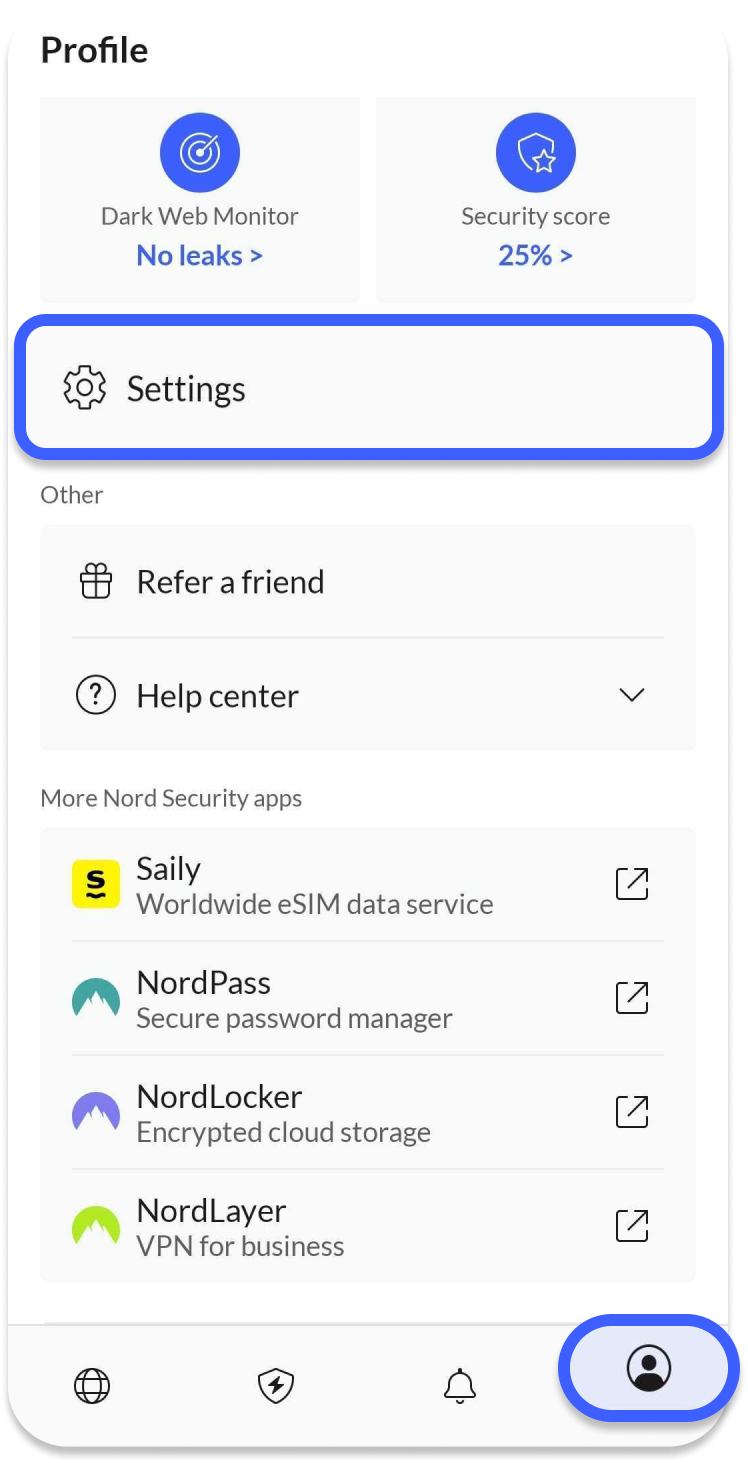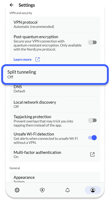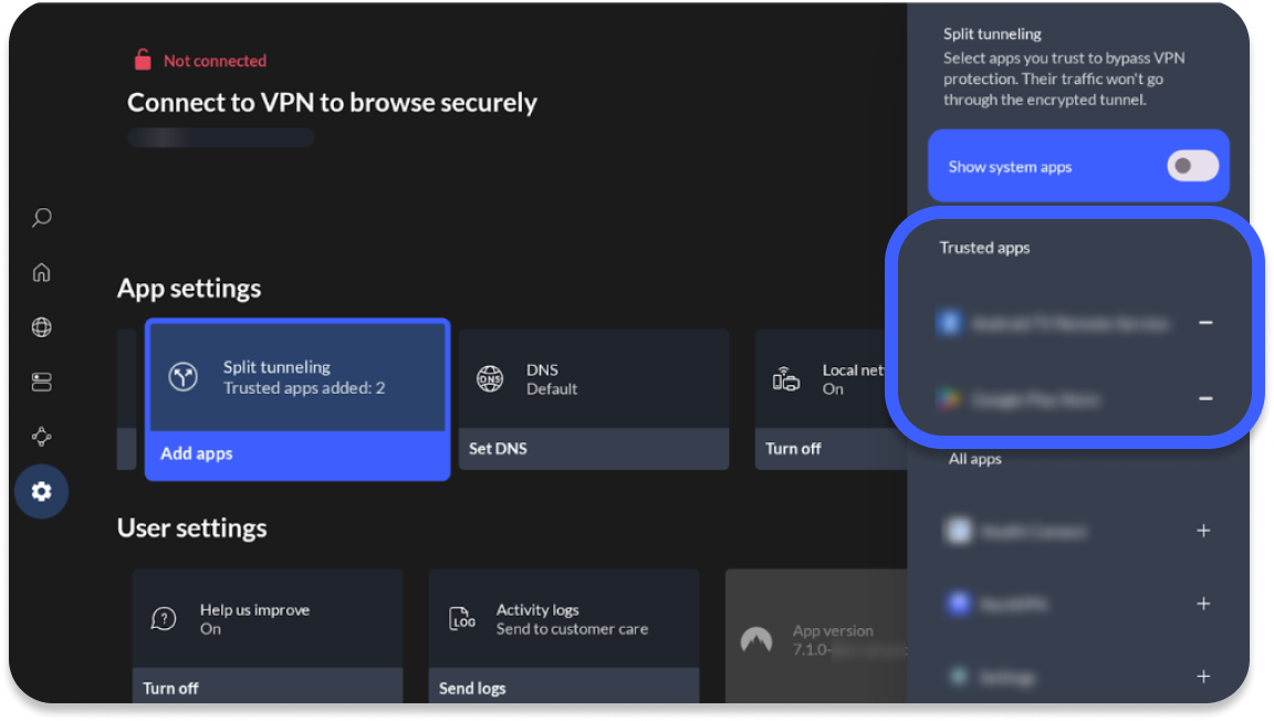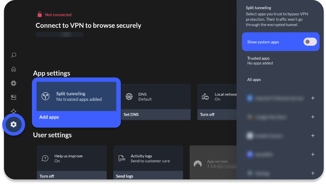 1. After you open the NordVPN app, select Settings, and, under App settings, choose Add apps next to Split tunneling. Once you select the apps of your choice, they will appear under Trusted apps.