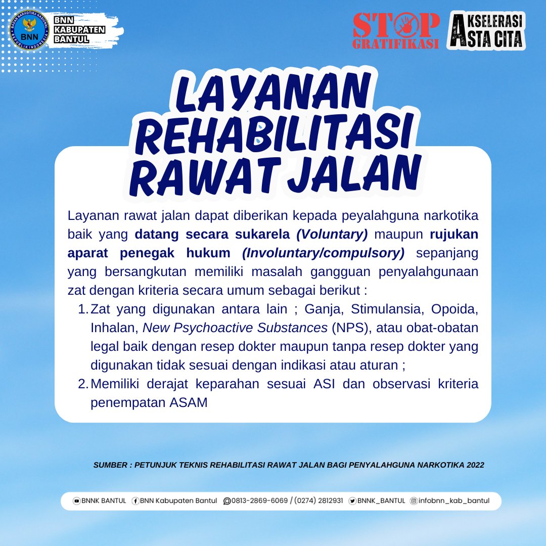 Halo Kawan Bawana! Siapa aja yang bisa Rehabilitasi Rawat Jalan? Yuk simak biar gak bingung! Rehabilitasi rawat jalan bisa untuk kamu yang butuh pemulihan tanpa rawat inap seperti penyalahgunaan narkoba. Yuk! Jangan ragu untuk mulai langkah kecil menuju pemulihan! https://t.co/MaRQwb2Rt1