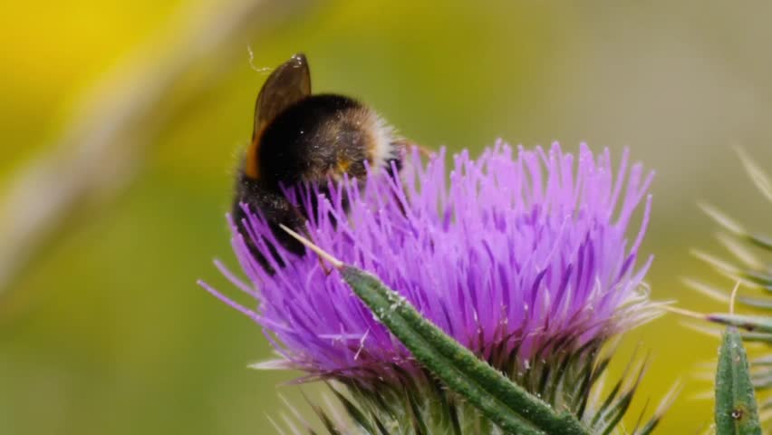 close up footage of thistles in bloom with bumblebee collecting nectar . | 23,192 | ./train/img_23192.jpeg | [