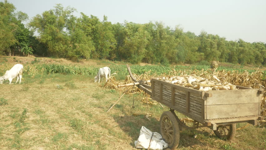 a farmer carrying a bamboo basket of corn on shoulders in a corn field for loading into his wooden cart in the foreground | 31,950 | ./train/img_31950.jpeg | [
