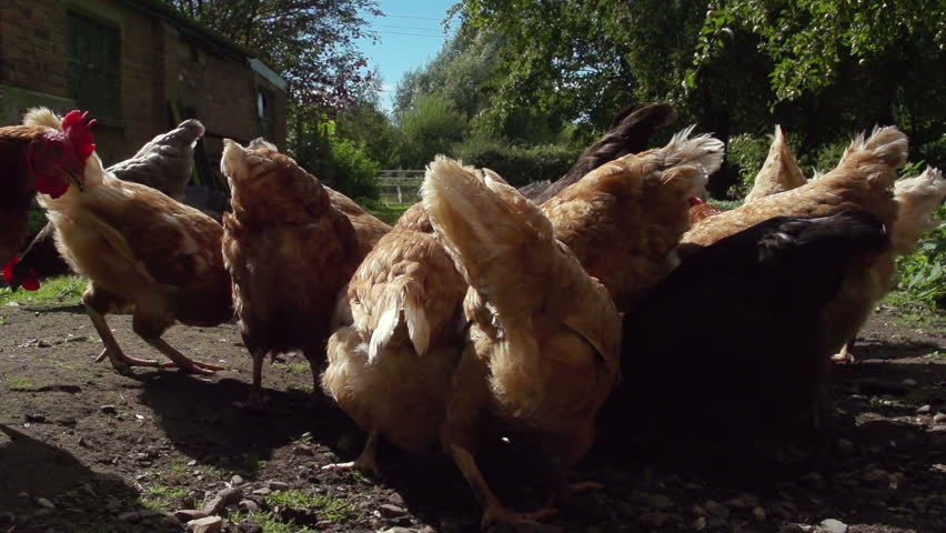 low angle shot of a group of free range chickens enjoying eating grain and corn in the sunshine . | 38,116 | ./train/img_38116.jpeg | [