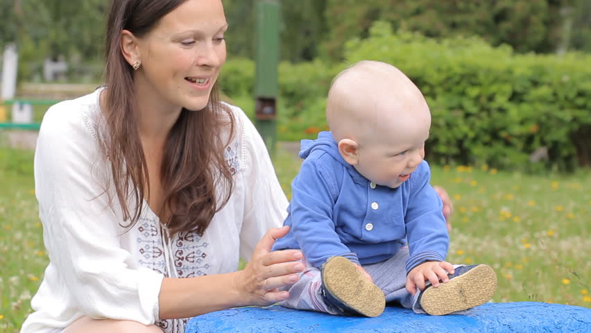 beautiful baby boy with his mother sitting on a blue rock and smiling in the park | 38,414 | ./train/img_38414.jpeg | [