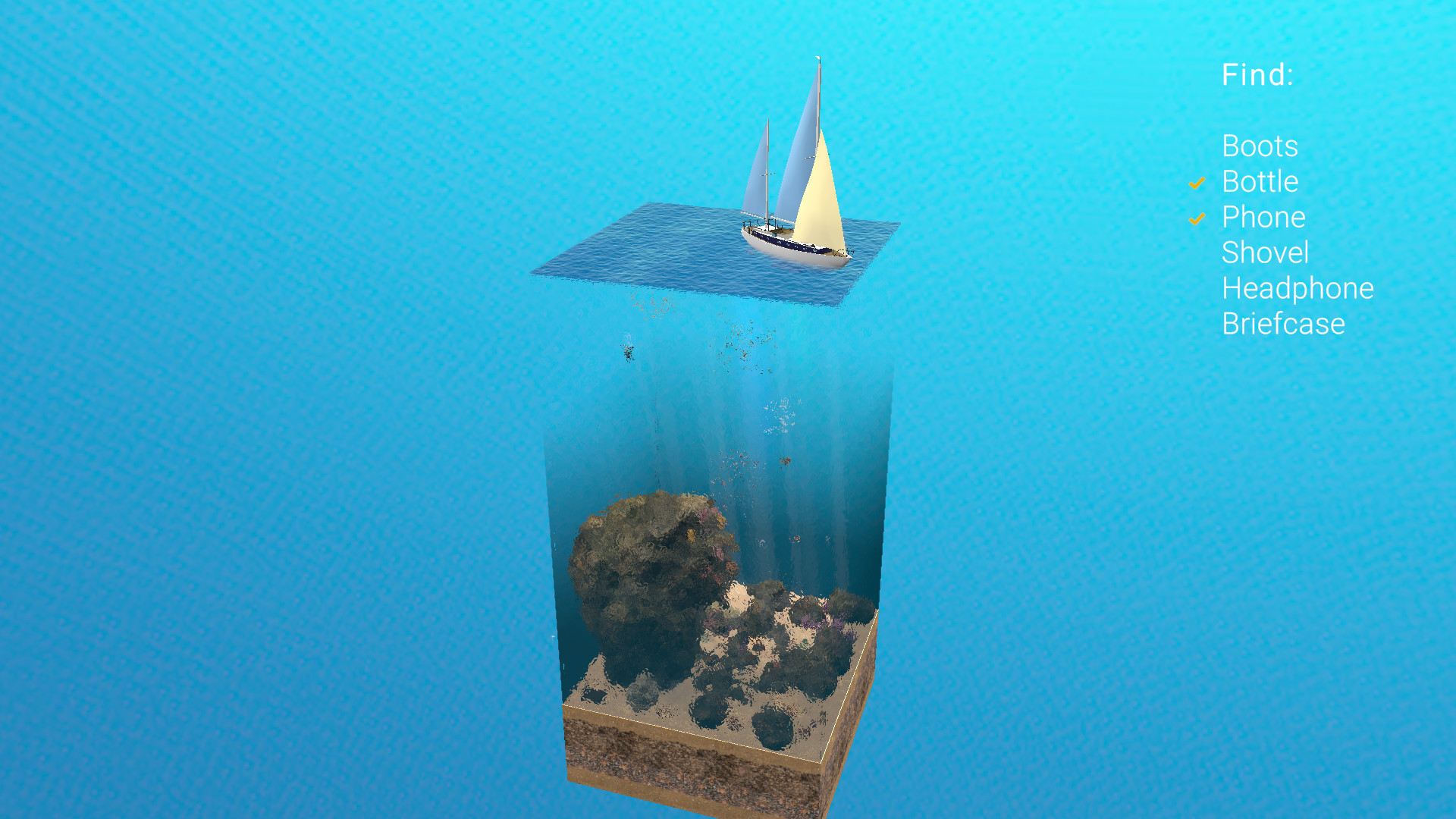 1,512,730 | 1,512,730 | Relax It's Aqua | Apr 17, 2021 | 0 | 5.99 | 0 | Relax It's Aqua is an underwater hidden objects finding atmospheric experience. Each scene will be set in a different aquatic environment. There is no time limit to rush you through the levels. No Boss fights to fight, XP points to keep track of and no story to progress through. Just explore the areas at your own leisure. It's a relaxing and meditating experience that takes your mind off everyday distractions. Every scene is carefully constructed so when you zoom out further it gives you fantastical three dimensional isometric art style vibe to the scene. You play as the diver and will be given a list of objects to find spread throughout the scene. You will be able to control the scuba diver in a 3D world and reach each object by getting close to it and cross it off of the list. Enjoy the aquatic life with full of swimming fish, colorful reef, plants, rocks set in ocean, lake and river environments. Featuring original smooth chill soundtrack and simple minimalistic and easy to follow user interface. | Relax It's Aqua is an underwater hidden objects finding atmospheric experience. Each scene will be set in a different aquatic environment. There is no time limit to rush you through the levels. No Boss fights to fight, XP points to keep track of and no story to progress through. Just explore the areas at your own leisure. It's a relaxing and meditating experience that takes your mind off everyday distractions. Every scene is carefully constructed so when you zoom out further it gives you fantastical three dimensional isometric art style vibe to the scene. You play as the diver and will be given a list of objects to find spread throughout the scene. You will be able to control the scuba diver in a 3D world and reach each object by getting close to it and cross it off of the list. Enjoy the aquatic life with full of swimming fish, colorful reef, plants, rocks set in ocean, lake and river environments. Featuring original smooth chill soundtrack and simple minimalistic and easy to follow user interface. | Relax It's Aqua is an underwater hidden objects finding atmospheric experience. Each scene will be set in a different aquatic environment. | null | https://Tesondo.com | https://Tesondo.com | null | true | false | false | 0 | null | 1 | 0 | null | English | null | [{'title': "Buy Relax It's Aqua", 'description': '', 'subs': [{'text': "Relax It's Aqua - $5.99", 'description': '', 'price': 5.99}]}] | Tesondo | Tesondo | Single-player,Full controller support | Adventure,Casual,Indie | http://cdn.akamai.steamstatic.com/steam/apps/256816874/movie_max.mp4?t=1610119981 | 0 | null | 1 | 0 | 0 - 20000 | 0 | 0 | 0 | 0 | 0 | Hidden Object,Puzzle,Exploration,Adventure,Minimalist,Casual,Atmospheric,Clicker,Experimental,Walking Simulator,Immersive Sim,Investigation,3D,Cinematic,Colorful,Isometric,Third Person,Education,Family Friendly,Nature | ||