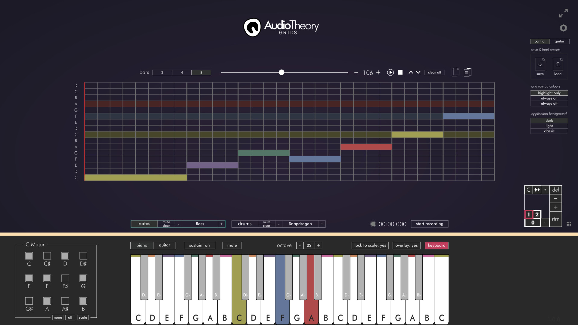 1,370,780 | 1,370,780 | AudioTheory Grids | Sep 25, 2020 | 0 | 6.99 | 0 | AudioTheory Grids combines intuitive music theory tools with the power of a grid-based sequencer. Customise your grid, program in a composition and then play it back on the piano and fretboard diagrams. Features: Real-time playback across the keyboard and fretboard simultaneously A comprehensive set of input tools – cycle through multiple grids and quickly swap between arrangements during playback Drum grids with a selection of preset sounds Quickly save and load compositions using the universal text format established with AudioTheory Guitars Plus the extensive customisations AudioTheory is known for: Exclude notes or load a scale preset directly to the grid An intuitive colour-coding system to identify notes across different mediums Left-handed mode, shifted tunings, customisable grid highlighting options. Choose between guitar and bass fretboard diagrams. | AudioTheory Grids combines intuitive music theory tools with the power of a grid-based sequencer. Customise your grid, program in a composition and then play it back on the piano and fretboard diagrams. Features: Real-time playback across the keyboard and fretboard simultaneously A comprehensive set of input tools – cycle through multiple grids and quickly swap between arrangements during playback Drum grids with a selection of preset sounds Quickly save and load compositions using the universal text format established with AudioTheory Guitars Plus the extensive customisations AudioTheory is known for: Exclude notes or load a scale preset directly to the grid An intuitive colour-coding system to identify notes across different mediums Left-handed mode, shifted tunings, customisable grid highlighting options. Choose between guitar and bass fretboard diagrams. | AudioTheory Grids combines intuitive music theory tools with the power of a grid-based sequencer. Customise your grid, program in a composition and then play it back on the piano and fretboard diagrams. | null | https://audiotheory.co/ | https://audiotheory.co/ | fraser@audiotheory.co | true | true | true | 0 | null | 0 | 0 | null | English | null | [{'title': 'Buy AudioTheory Grids', 'description': '', 'subs': [{'text': 'AudioTheory Grids - $6.99', 'description': '', 'price': 6.99}]}] | Dracula's Cave | Dracula's Cave | null | Audio Production | http://cdn.akamai.steamstatic.com/steam/apps/256799401/movie_max.mp4?t=1599237326 | 0 | null | 6 | 1 | 0 - 20000 | 0 | 0 | 0 | 0 | 0 | Audio Production,Music | ||