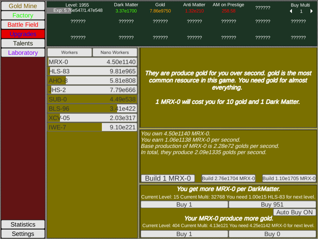 1,537,030 | 1,537,030 | Conquer The Universe | Mar 29, 2021 | 0 | 0 | 0 | Conquer the Universe(CTU) is a Free To Play Idle Incremental game. Build up yourself a robot army and try to conquer the universe with endless grow. Idle gameplay. Regular updates. Premium currency you can passively obtain at a decent pace, without paying a cent. Only toss me some cash because you want to, not because you need to in order to progress. Build workers, gather gold. Build the ultimate robot for combat. Unlock even more content. Defeat powerful bosses. Earn Anti Matter. Rebuild spend your Anti Matter on your workers or your ultimate robot. Automate your business. Unlimited progress. | Conquer the Universe(CTU) is a Free To Play Idle Incremental game. Build up yourself a robot army and try to conquer the universe with endless grow. Idle gameplay. Regular updates. Premium currency you can passively obtain at a decent pace, without paying a cent. Only toss me some cash because you want to, not because you need to in order to progress. Build workers, gather gold. Build the ultimate robot for combat. Unlock even more content. Defeat powerful bosses. Earn Anti Matter. Rebuild spend your Anti Matter on your workers or your ultimate robot. Automate your business. Unlimited progress. | Conquer the Universe(CTU) is a Free To Play Idle Incremental game. Build up yourself a robot army and try to conquer the universe with endless grow. | null | null | null | burakv61@gmail.com | true | false | false | 0 | null | 0 | 0 | null | English | null | [] | burrki | burrki | Single-player | Free to Play,RPG,Strategy | http://cdn.akamai.steamstatic.com/steam/apps/256827686/movie_max.mp4?t=1617041015 | 0 | null | 0 | 0 | 0 - 0 | 0 | 0 | 0 | 0 | 0 | null | ||