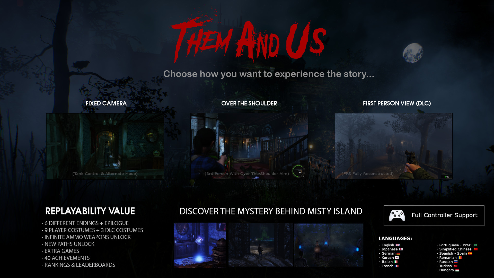 - Selected first-person POV for flashbacks, cutscenes, memories, etc. - Extra game content. Fixed Camera: This mode is designed for people that want a true classic survival horror experience. For those who like things hard and challenging. Over The Shoulder: Although we keep some classic elements in this mode, OTS is designed for people who want a more modern gaming experience, with a slightly easier (but still challenging in its own way) experience. Notice: The game pays homage to some of the classic survival horror games we love, expect to see some 'rooms' or 'Easter eggs' that may remind you of these games. Regardless of how you play, this game will not hold your hand. You will have to think for yourself about what needs to be done and how to progress the story. Use your own wits and intuition to make it out alive. Graphics - Post-process effects (bloom filters, god rays, etc.) added for increased immersion. - Crisp graphics with a 60 FPS default. Unlock FPS is available. - Optional reversion to first-gen console graphics. The retro mode also triggers fixed camera play for a greater challenge. -UltraWide (32:9) Support Gameplay - Realistic damage and dismemberment systems with accompanying gore. - In-world puzzles featuring ciphers and keys. - Resource management for true survival horror. Extra Content: Finish the game and unlock new costumes or weapons. There are different endings. Decide Alicia's fate yourself. | Them and Us is a classic, survival horror game with a focus on atmosphere and player immersion. Discover the truth of Alicia’s past as she descends further into her strange, unending nightmare. | “I did not feel that my time was wasted, as a matter of fact, I was left wanting much more.” Save or Quit | https://www.tendogames.com/themandus/ | http://www.tendogames.com/ | contact@tendogames.com | true | false | false | 0 | null | 40 | 617 | null | English,Simplified Chinese,Turkish,French,German,Japanese,Portuguese - Brazil,Korean,Italian,Romanian,Russian,Spanish - Spain,Hungarian | English,Russian,Hungarian | [{'title': 'Buy Them and Us', 'description': '', 'subs': [{'text': 'Them and Us - $39.99', 'description': '', 'price': 39.99}]}] | TendoGames Co., Ltd. | TendoGames Co., Ltd. | Single-player,Steam Achievements,Full controller support,Steam Trading Cards,Steam Cloud,Stats,Steam Leaderboards | Action,Indie | http://cdn.akamai.steamstatic.com/steam/apps/256750428/movie_max.mp4?t=1597456504,http://cdn.akamai.steamstatic.com/steam/apps/256750424/movie_max.mp4?t=1597456512,http://cdn.akamai.steamstatic.com/steam/apps/256748775/movie_max.mp4?t=1597456520 | 0 | null | 539 | 128 | 0 - 20000 | 0 | 0 | 0 | 0 | 13 | Survival Horror,Action,Gore,Indie,Violent,Horror,Female Protagonist,Classic,Zombies,Third-Person Shooter,Singleplayer | ||