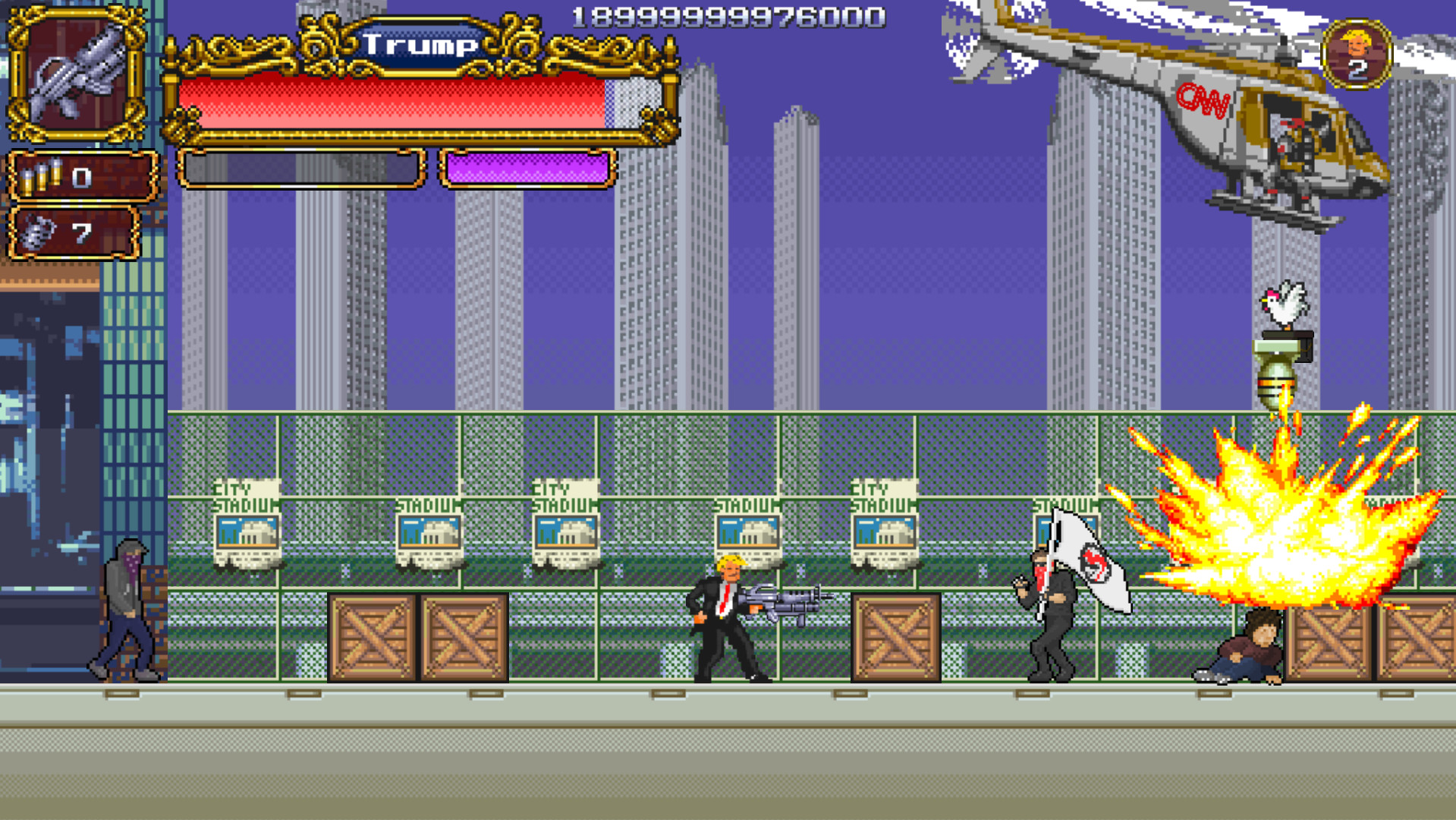 1,072,350 | 1,072,350 | America's Retribution Term 2 | May 9, 2019 | 0 | 5.99 | 0 | He's back! The American President is locked and loaded for his second term. This time he must find the source of the ultimate evil corruption. And destroy it. Better weapons, better graphics, better music, better everything! Battle your way through the city streets of Chicago to the jungles of Africa fighting terrorists, fascists, fake News media and evil globalists. Get help from supporters and cabinet members like vice President Pence. Equip new devastating weapons like the super shotgun and rocket launcher! Defend yourself with the all new plasma shield. Side scrolling action like never before. Jump, duck, dodge and blast your way through or use your smart phone and call in an air strike! But beware of the opposition as then will do anything to try and take you down. This is it. The final battle of good vs evil is in your hands. Good luck. | He's back! The American President is locked and loaded for his second term. This time he must find the source of the ultimate evil corruption. And destroy it. Better weapons, better graphics, better music, better everything! Battle your way through the city streets of Chicago to the jungles of Africa fighting terrorists, fascists, fake News media and evil globalists. Get help from supporters and cabinet members like vice President Pence. Equip new devastating weapons like the super shotgun and rocket launcher! Defend yourself with the all new plasma shield. Side scrolling action like never before. Jump, duck, dodge and blast your way through or use your smart phone and call in an air strike! But beware of the opposition as then will do anything to try and take you down. This is it. The final battle of good vs evil is in your hands. Good luck. | He's back! The American President is locked and loaded for his second term. Battle your way through the city streets of Chicago to the jungles of Africa fighting terrorists, fascists, fake News media and evil globalists. | null | https://www.retrogamer3.com/ | https://www.facebook.com/RetroGamer3Page | null | true | false | false | 0 | null | 0 | 0 | Game contains violence and coarse language. | English | English | [{'title': "Buy America's Retribution Term 2", 'description': '', 'subs': [{'text': "America's Retribution Term 2 - $5.99", 'description': '', 'price': 5.99}]}] | Ed Findlay | Ed Findlay | Single-player,Steam Achievements,Partial Controller Support | Action,Indie | http://cdn.akamai.steamstatic.com/steam/apps/256748804/movie_max.mp4?t=1556243464 | 0 | null | 8 | 1 | 0 - 20000 | 0 | 0 | 0 | 0 | 0 | Action,Indie,Gore,Violent | ||