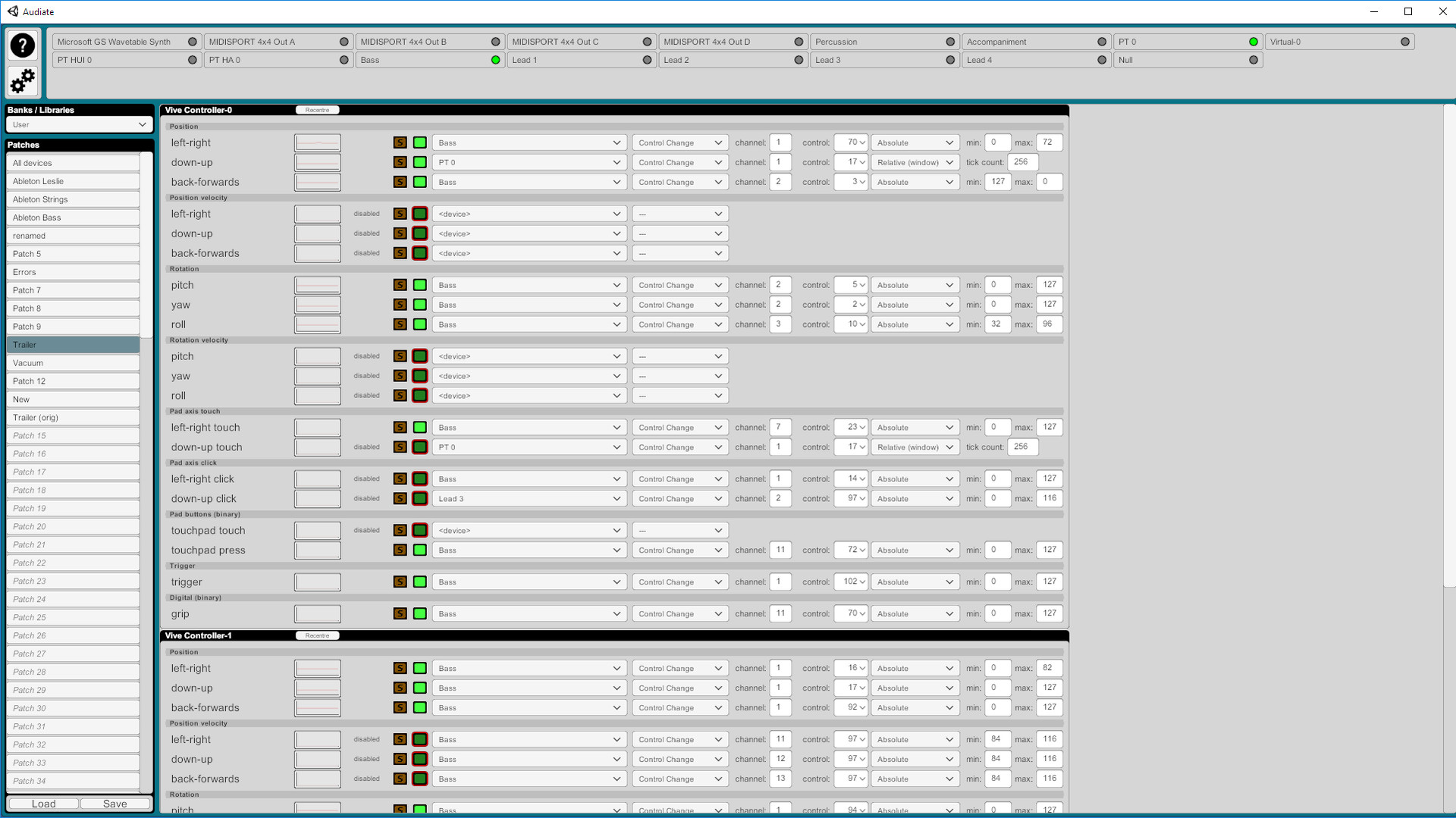 886,480 | 886,480 | Audiate | Oct 29, 2018 | 0 | 29.99 | 0 | Important Requires OpenVR controllers or trackers. HMD is not used. About the Software Audiate allows you to map any MIDI-capable audio/video production tool to the position, orientation, and buttons on any OpenVR input device. With six assignable inputs per control from position & rotation alone it provides far more control per hand than would be possible with traditional finger-operated faders, knobs, & modwheels. Note : The HMD display is not used, Audiate is intended to be integrated into an existing production tool-chain alongside physical instruments, other control surfaces, & software. It acts as an additional control surface for you to map as you see fit. As with most physical control surfaces it does not output actual musical notes as MIDI or audio streams, instead it focuses on providing hands-on control of live and post-production effects provided by MIDI capable hardware & software. In effect the application operates like a 6-dimensional floating MIDI modwheel. Application Features Map OpenVR input devices to any MIDI software & hardware Load & save patch configurations Pre-configured library patches available in banks Configurable control code number lists Configurable surface size & optional haptics Extremely low CPU/GPU usage, performs no 3D rendering Detailed documentation including tutorials for several popular DAWs Audiate is built on top of VR input hardware as this offers unparalleled accuracy and low-latency tracking on consumer-grade hardware. These requirements are as important to music production as they are to VR. For further details please see the application documentation, this is available in PDF format on the store page. Example Usages Attach a tracker to an arm, leg, foot or head to control a physical instrument or effect while performing Attach a tracker to any instrument, allowing for electric-guitar-like neck shake vibrato effects Recording multiple automation values simultaneously during mastering Control panning for surround-sound media Controlling MIDI-capable stage-lighting Hardware Support Please note that the HMD is not used in this application. Audio production tools generally require significant system resources and are also often vulnerable to undesirable latency issues on busy systems. Audiate is designed to work alongside these tools as an enhancement to an existing tool chain rather than a replacement; as such it tries to keep its own system requirements to an absolute minimum. The following input devices have pre-configured profiles: HTC Vive Controllers HTC Vive Trackers Oculus Rift Support for other devices can be added by editing the application configuration files. Any OpenVR-compatible input device is supported. All tracked controllers provide the following inputs: 3 position analogue axes per controller 3 rotation analogue axes per controller In addition to this, a Vive Controller also provides: 3 button-based analogue axes per controller (trigger & touchpad x/y) 1 digital axis (grip button) Any additional inputs provided by OpenVR devices can be configured to make use of them. Functionality is provided to normalize & smooth values if required. Some trackers also allow for adding custom-built inputs via exposed electrical hookups, advanced users can build and configure entirely custom devices of their own design. The configuration system can also be used to provide inputs bound to button presses. For example a user could set up a series of X, Y, & Z axes that only output when a particular button is held, with the previous value being held until next used. Application Support Audiate can work with any application or hardware that is capable of using MIDI control codes to change parameter values. This includes VST-based musical instruments & effect modules, as well as other usages outside of audio/video production. Hardware modules with MIDI capabilities can be connected in the usual way to the system running Audiate. It is not required that the connected module is capable of customizing it's own mappings, Audiate can be configured to make use of hard-coded ones such as those found in keyboard synths. Support is provided for mapping files (midnam & csv) to aid in the setting up of devices by listing the control name inside Audiate. Value output is typically the absolute value which works in most cases however support is provided for software/hardware that requires relative input, as commonly used by 'infinite knob'-based control surfaces. This mode exists to provide support in DAWs that are known to be difficult in their MIDI connectivity. Full details of the capabilities of this emulation mode are available in the manual. | Audiate allows you to map any MIDI-capable audio/video production tool to the position, orientation, and buttons on any OpenVR input device. With six assignable inputs per control from position & rotation alone it provides far more control per hand than would be possible with traditional finger-operated faders, knobs, & modwheels. Note : The HMD display is not used, Audiate is intended to be integrated into an existing production tool-chain alongside physical instruments, other control surfaces, & software. It acts as an additional control surface for you to map as you see fit. As with most physical control surfaces it does not output actual musical notes as MIDI or audio streams, instead it focuses on providing hands-on control of live and post-production effects provided by MIDI capable hardware & software. In effect the application operates like a 6-dimensional floating MIDI modwheel. Application Features Map OpenVR input devices to any MIDI software & hardware Load & save patch configurations Pre-configured library patches available in banks Configurable control code number lists Configurable surface size & optional haptics Extremely low CPU/GPU usage, performs no 3D rendering Detailed documentation including tutorials for several popular DAWs Audiate is