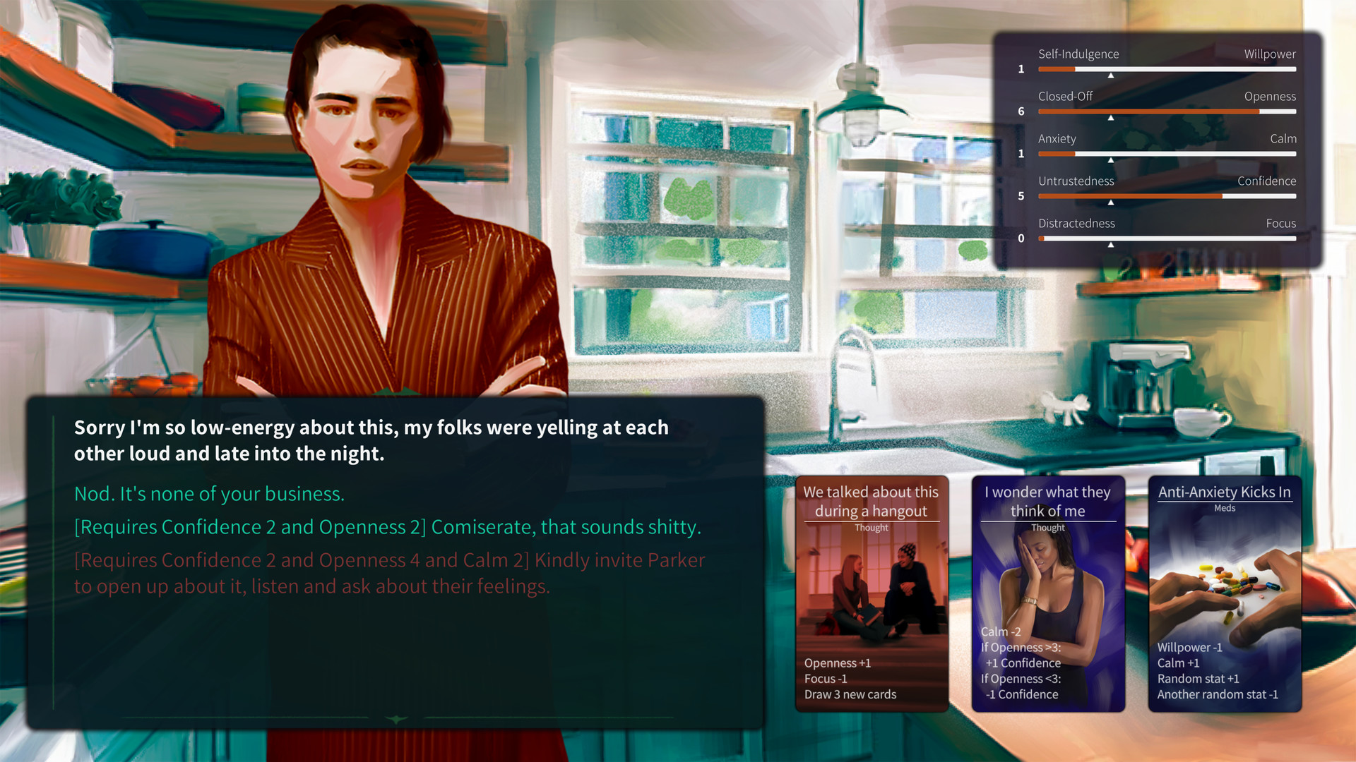 1,324,360 | 1,324,360 | Brain Please Don't | Jul 1, 2020 | 0 | 0.99 | 0 | Brain Please Don’t lets you try Cameron’s week with various different versions of the teenager, and each choice made along the way changes Cameron’s inner universe, and the deck that represents it. In each encounter, play the cards that represent Cameron’s inner workings, thoughts and impulses. Like in any teenager’s life, avoiding self-doubt, anxiety and inadequacy will be a constant challenge. Those challenges can only be meaningfully overcome if the psyche changes to manage them, if you build the deck into a better version of itself through the choices made. Having better mental states give you access to more answers, and good answers can sometimes create better general states of mind. The game is all about trying to construct positive psychological spirals, while also looking at what happens when that can’t be the case. Not all endings are always happy, not all darkness is always pitch black, and only your take of each playthrough can explore the various paths and destinations of this short game. | Brain Please Don’t lets you try Cameron’s week with various different versions of the teenager, and each choice made along the way changes Cameron’s inner universe, and the deck that represents it. In each encounter, play the cards that represent Cameron’s inner workings, thoughts and impulses. Like in any teenager’s life, avoiding self-doubt, anxiety and inadequacy will be a constant challenge. Those challenges can only be meaningfully overcome if the psyche changes to manage them, if you build the deck into a better version of itself through the choices made. Having better mental states give you access to more answers, and good answers can sometimes create better general states of mind. The game is all about trying to construct positive psychological spirals, while also looking at what happens when that can’t be the case. Not all endings are always happy, not all darkness is always pitch black, and only your take of each playthrough can explore the various paths and destinations of this short game. | Brain Please Don’t is a small game exploring a snapshot of modern teenage life, with an innovative deckbuilding and card-game mechanic studying the inner turmoils, dysfunctionalities and means of improving the situation of one’s psyche. Can you leave young Cameron better off? | null | https://critique-gaming.com | null | support@critique-gaming.com | true | true | true | 0 | null | 0 | 0 | The game looks at psychological anguish and issues in a serious matter, which includes symbolic depictions and study of these matters. | English | null | [{'title': "Buy Brain Please Don't", 'description': '', 'subs': [{'text': "Brain Please Don't - $0.99", 'description': '', 'price': 0.99}]}] | Critique Gaming | Critique Gaming | Single-player | Adventure,Casual,Indie,Simulation | http://cdn.akamai.steamstatic.com/steam/apps/256789319/movie_max.mp4?t=1592335692 | 0 | null | 9 | 3 | 0 - 20000 | 0 | 0 | 0 | 0 | 0 | Indie,Casual,Adventure,Simulation,Card Game,Realistic,Psychological,Story Rich,Singleplayer,Mature,Choices Matter | ||