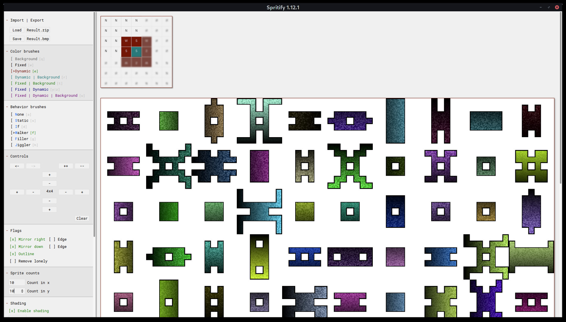 1,593,130 | 1,593,130 | Spritify | Apr 23, 2021 | 0 | 9.99 | 0 | Spritify is a tool for the fast and easy generation of 2D sprites. It transforms simple input images consisting of smart pixels into many distinct output images with varying properties, such as gradient, noise and color which can then be exported and used in your projects. Demo version There's a demo version of Spritify that you can get for free to evaluate it. In the demo some of the import and export functions are disabled. Also many of the sizes and factors are greatly limited (Palette, Canvas, Sprite counts, Scaling factors, ...). All other features are available. Guide Quick overview Hotkeys Note that several functions can also be performed via hotkeys. Hover your cursor over functions to see if there's a hotkey mapped to it. Canvas On the canvas you can draw your input image which is then used to generate your sprites. The canvas displays both the color and behavior of individual pixels. The color is displayed as a pixel's color, the behavior as a character (More under Brushes ). You can left click to draw single pixels, drag while holding the left mouse button to draw a path or right click to flood fill. By default the canvas is filled with the Background color and N one behavior When hovering with your cursor, the currently active brush will be displayed The canvas after drawing several pixels The Preview Below the canvas there's a preview of the sprite. It will display the same result you'd receive by performing an export. Please note that the preview's pixels are scaled to always use all available space, your exported result will likely have smaller pixels. Sidebar The sidebar contains all of Spritify's settings and controls. The sidebar is split in groups which can be expanded and collapsed by clicking a group's header. Import | Export Here you can save and load projects and export your sprites. Load Import a previously saved Spritify project You can also import projects by opening the files with Spritify or using drag&drop Save Save your current project Result.zip Export your sprite as .zip archive containing the individual .bmp images Result.bmp Export your sprite as a single .bmp image (What you see in the preview) Brushes Your current brush and pixels on the canvas consist of a color and behavior . The different brushes are described below. Color brushes The color brushes set the color a pixel will have. The currently active brush is highlighted with [> You'll notice that each name here has its distinct color. These colors are also placed on the canvas when drawing with that brush. Background Drawing pixels with the background color (similar to erasing pixels) You can set the background color in the Colors controls Fixed Drawing pixels with the fixed color Pixels using this color will always have the same color. You can define which color to use in Colors Dynamic Drawing pixels with the dynamic color Pixels using this color will vary in color. They might each end up with a different color, noise and shading in your final sprite. Many settings affect how these pixels behave, see more under Flags , Shading , Noise and Palette Dynamic | Background Pixels will randomly either become a Dynamic or Background pixel with a 50/50 chance Fixed | Background Pixels will randomly either become a Fixed or Background pixel with a 50/50 chance Fixed | Dynamic Pixels will randomly either become a Fixed or Dynamic pixel with a 50/50 chance Fixed | Dynamic | Background Pixels will randomly either become a Fixed , Dynamic or Background pixel with a 33/33/33 chance Behavior brushes The behavior brushes define the behavior of a pixel during the generation process. The currently active brush is highlighted with [> You'll notice that the first character of each brush is highlighted. That's the character that is being placed onto the canvas if you use this brush. None This is basically the 'background' or 'off' of the behaviors. Pixels of this type are considered to not exist at all during the simulation Static This is basically the 'on' of the behaviors. Pixels of this type are always active and considered to be present during the simulation If Pixels of this type are considered to be Static if they have a neighbor, otherwise they are considered to the None . With these pixels you can define areas that all turn on or off together Walker These pixels will leave a trail on the canvas by following a random path. They'll stop randomly or if they hit something. They behave similar to the Snake game Filler Pixels of this type will fill their surrounding area to a random degree. They are similar to the Walker pixels but instead of creating a trail, they create more radial shapes like drops of ink Jiggler Jigglers will move randomly to a neighbor position or remain where they are Any Chooses any of the other behaviors randomly In this example you can see two groups of If pixels and a group of Filler pixels. In the result you'll notice that the If groups are either present entirely or not at all. Whenever one of the Filler pixels reached one of the groups, the entire group got activated. (One of the If pixels activates due to having a neighbor, which then can activate another If pixel until the entire group is active) Controls Here you can find various functions to edit the canvas. Arrow left Undo the last canvas action (drawing, resizing) Arrow right Redo the last canvas action (drawing, resizing) ++ Zoom in, displaying the canvas with larger pixels -- Zoom out, displaying the canvas with smaller pixels + Increase the size of the canvas by adding a row or column depending on the location of the button - Decrease the size of the canvas by removing a row or column depending on the location of the button 7x6 The current size is displayed at the center ClearI Clear the canvas resetting all invisible pixels (outside of current drawing area) ClearA Clear the canvas resetting all pixels Flags In this group you can find multiple flags to control th