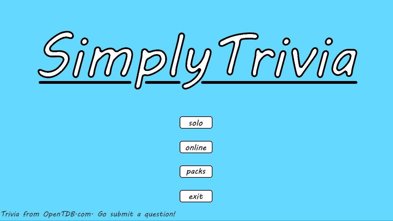 832,430 | 832,430 | SimplyTrivia | May 14, 2018 | 0 | 0.99 | 0 | Do you want a trivia game with next to no frills? Then you've found it! This is SimplyTrivia, here are the features: Online Trivia Database: The main source of trivia is OpenTDB. Feel free to submit questions there! Custom Question Packs: Create, download, and use packs of questions as trivia sources! Includes an intuitive and easy to use built-in editor for creating question packs. | Do you want a trivia game with next to no frills? Then you've found it! This is SimplyTrivia, here are the features: Online Trivia Database: The main source of trivia is OpenTDB. Feel free to submit questions there! Custom Question Packs: Create, download, and use packs of questions as trivia sources! Includes an intuitive and easy to use built-in editor for creating question packs. | SimplyTrivia: Multiplayer trivia with no frills. Features use of an Online Trivia Database (OpenTDB), and the ability to create your own packs of questions! | null | null | null | hootlessbusiness@gmail.com | true | false | false | 0 | null | 0 | 0 | null | English | null | [{'title': 'Buy SimplyTrivia', 'description': '', 'subs': [{'text': 'SimplyTrivia - $0.99', 'description': '', 'price': 0.99}]}] | nanzington | nanzington | Single-player | Casual | http://cdn.akamai.steamstatic.com/steam/apps/256712391/movie_max.mp4?t=1522355388 | 0 | null | 0 | 0 | 0 - 20000 | 0 | 0 | 0 | 0 | 0 | null | ||