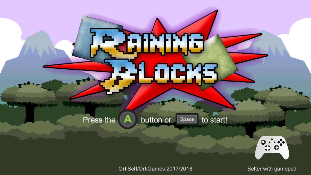 Complete free game! No ads, no micro-transactions! The perfect game when you have little spare time or when you just want to play one fast game before leaving to do something else! Raining blocks it's a game where you need to avoid the blocks that fall, which you push and pull to escape or survive longer. It has a split screen so you can play against a friend, where you need to connect blocks of the same color to make his life harder! It has achievements and leader boards. With three game modes (classic, extended and split screen) and three difficulty modes (easy, normal, hard) . The game also have six characters to play, four gadgets to use and three bonuses to apply (combine them as you wish). With music by Sergio Gordillo Bellido (www.xperimentmusic.bandcamp.com) and art from the community (CC and Public domain). Remember to take a look on the about section to know who helped sharing his work(thanks again everyone)! Have fun!