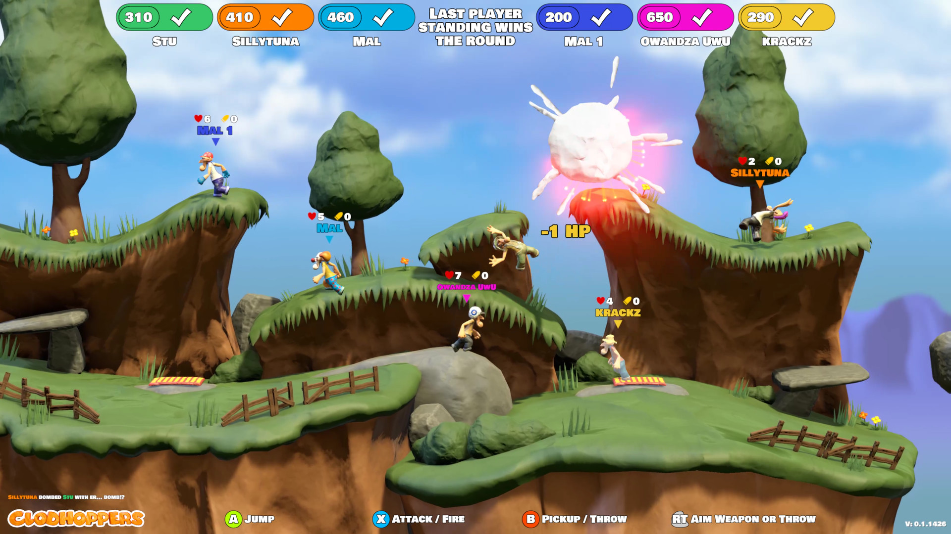 1,066,420 | 1,066,420 | Clodhoppers | Apr 28, 2021 | 0 | 0 | 0 | Clodhoppers is a 1-8 player online and local single/multiplayer brawler designed around quick games and big laughs, a cross between Worms and Smash Bros. The artwork is created using clay models and stop motion animation to give a unique aesthetic. It's led by the creator of Platypus, Anthony Flack and is the spiritual successor to Cletus Clay MELEE FISTICUFFS Clodhoppers love a bit of hand to hand, axe to foot or crate to head combat. All the good stuff they used to do with Grandpa when they were kids - good clean fun. RANGED WEAPONRY When the pressure is on, it’s great to have a good old fire-in-a-general-direction shotgun by your side. If accuracy is your thing, don’t rely on old fashioned Clodhopper tech, grab an Alien blaster and aim between the eyes. ALIEN MENACE A new pestilence has plagued the Clodhoppers’ farm land. Aliens messing with crops ‘n’ cows just won’t do, send them home or to oblivion and let's get back to fighting each other. UP TO 8 PLAYERS Clodhoppers is a game about friends, drop kicking friends, and smashing a crate on their head. It never gets old, I tell you, the times I’ve been knocked off a cliff… Ah, warm memories. SHARPEN YOUR SKILLS Clodhoppers love to train in the little-known martial art of ‘dirty scrapping’. While your friends are nursing their pride, sharpen your dropkicks and uppercuts in the score attack modes. Game Features: Online/Local Multiplayer brawling for up to 8 players Stop-motion animated clay characters Pickup'n'play controls Hicks (and soon... cows... and then... thieving alien scum) Multiple controller support | Clodhoppers is a 1-8 player online and local single/multiplayer brawler designed around quick games and big laughs, a cross between Worms and Smash Bros. The artwork is created using clay models and stop motion animation to give a unique aesthetic. It's led by the creator of Platypus, Anthony Flack and is the spiritual successor to Cletus Clay MELEE FISTICUFFS Clodhoppers love a bit of hand to hand, axe to foot or crate to head combat. All the good stuff they used to do with Grandpa when they were kids - good clean fun. RANGED WEAPONRY When the pressure is on, it’s great to have a good old fire-in-a-general-direction shotgun by your side. If accuracy is your thing, don’t rely on old fashioned Clodhopper tech, grab an Alien blaster and aim between the eyes. ALIEN MENACE A new pestilence has plagued the Clodhoppers’ farm land. Aliens messing with crops ‘n’ cows just won’t do, send them home or to oblivion and let's get back to fighting each other. UP TO 8 PLAYERS Clodhoppers is a game about friends, drop kicking friends, and smashing a crate on their head. It never gets old, I tell you, the times I’ve been knocked off a cliff… Ah, warm memories. SHARPEN YOUR SKILLS Clodhoppers love to train in the little-known martial art of ‘dirty scrapping’. While your friends are nursing their pride, sharpen your dropkicks and uppercuts in the score attack modes. Game Features: Online/Local Multiplayer brawling for up to 8 players Stop-motion animated clay characters Pickup'n'play controls Hicks (and soon... cows... and then... thieving alien scum) Multiple controller support | Clodhoppers is an online and local single/multiplayer brawler designed around quick games and big laughs. All the artwork is created using clay models and stop motion animation to give a unique aesthetic. | null | https://claymatic.games/ | https://discordapp.com/invite/NTugxBY | null | true | true | false | 0 | null | 0 | 0 | null | English | English | [] | Claymatic Games | Claymatic Games | Single-player,Multi-player,PvP,Online PvP,Shared/Split Screen PvP,Co-op,Online Co-op,Shared/Split Screen Co-op,Shared/Split Screen,Partial Controller Support | Action,Indie,Early Access | http://cdn.akamai.steamstatic.com/steam/apps/256779862/movie_max.mp4?t=1585764549 | 0 | null | 39 | 1 | 0 - 20000 | 0 | 0 | 0 | 0 | 0 | Indie,Action,Early Access | ||