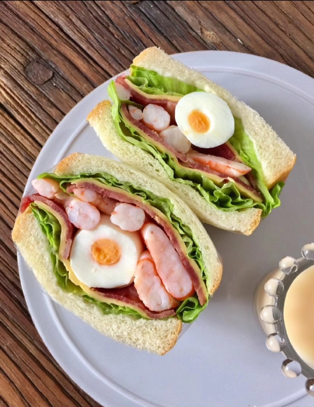 Shrimp and Ham Sandwich | ["bread","shrimp","ham","lettuce","egg"] | ["bread:100g","shrimp:50g","ham:50g","lettuce:30g","egg:50g"] | |