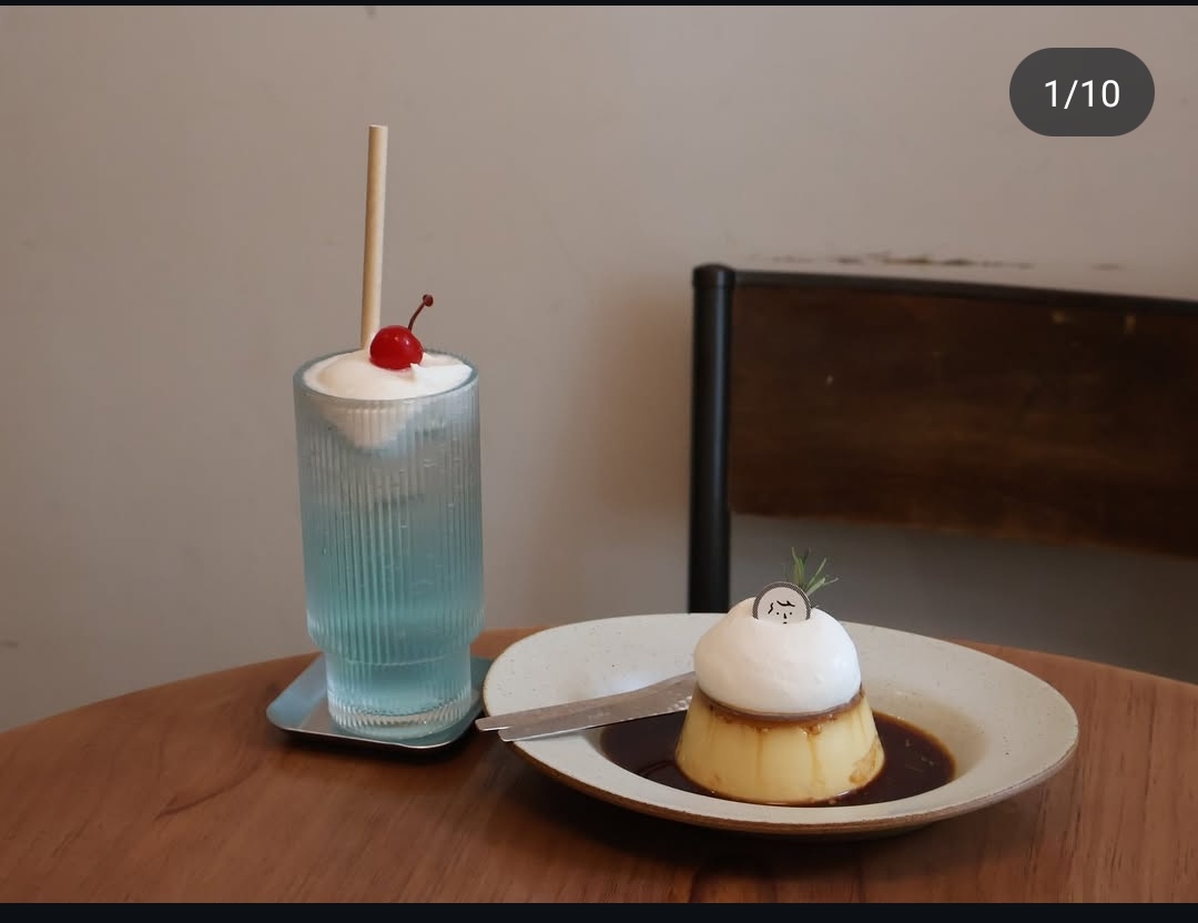 Flan with a drink | ["flan","cream","sugar","water","cherry"] | ["flan:150g","drink:250ml"] | |