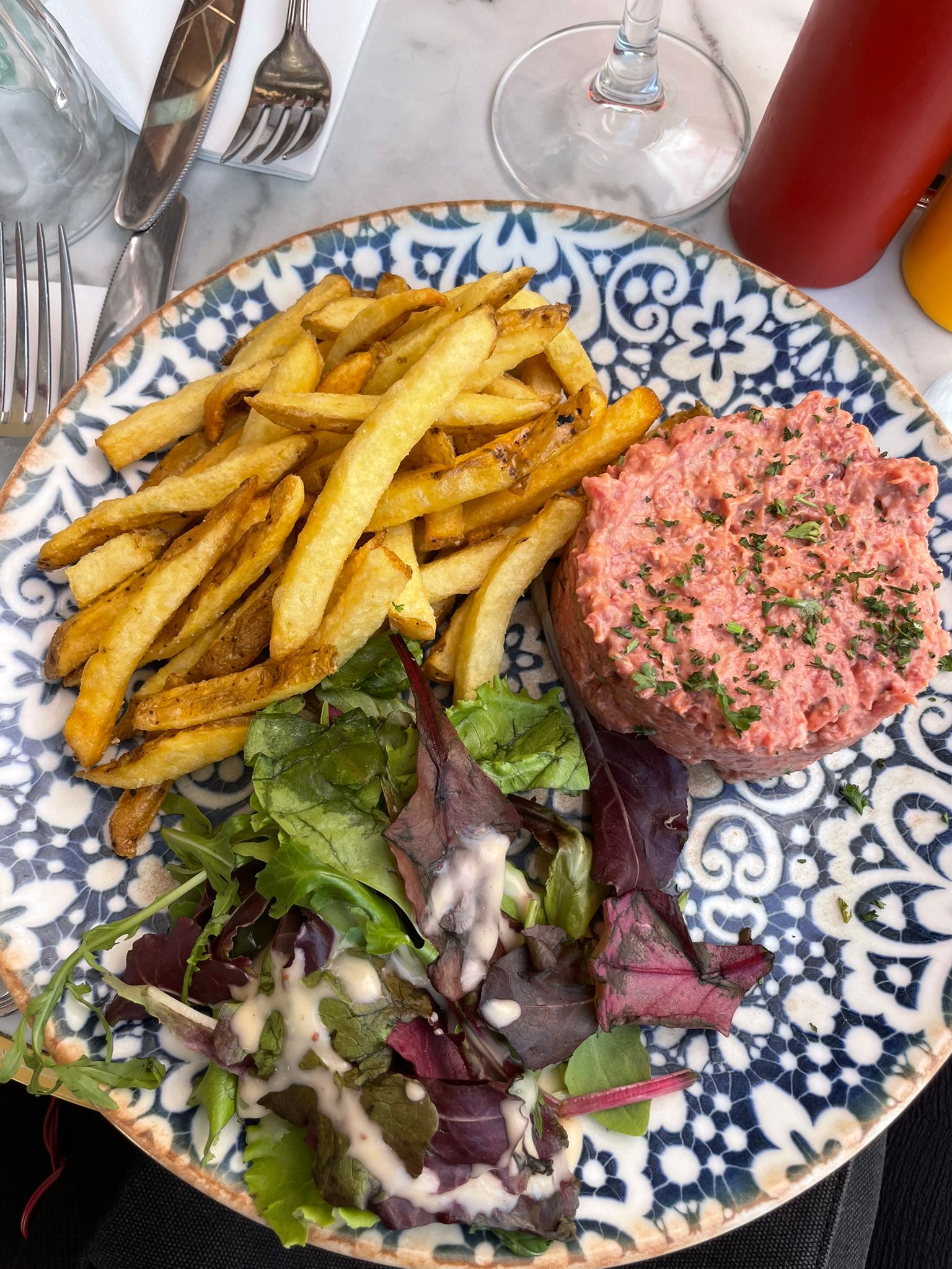 Steak Tartare with Fries | ["fries","beef","mixed greens","dressing"] | ["fries:200g","meat:150g","salad:100g"] | |