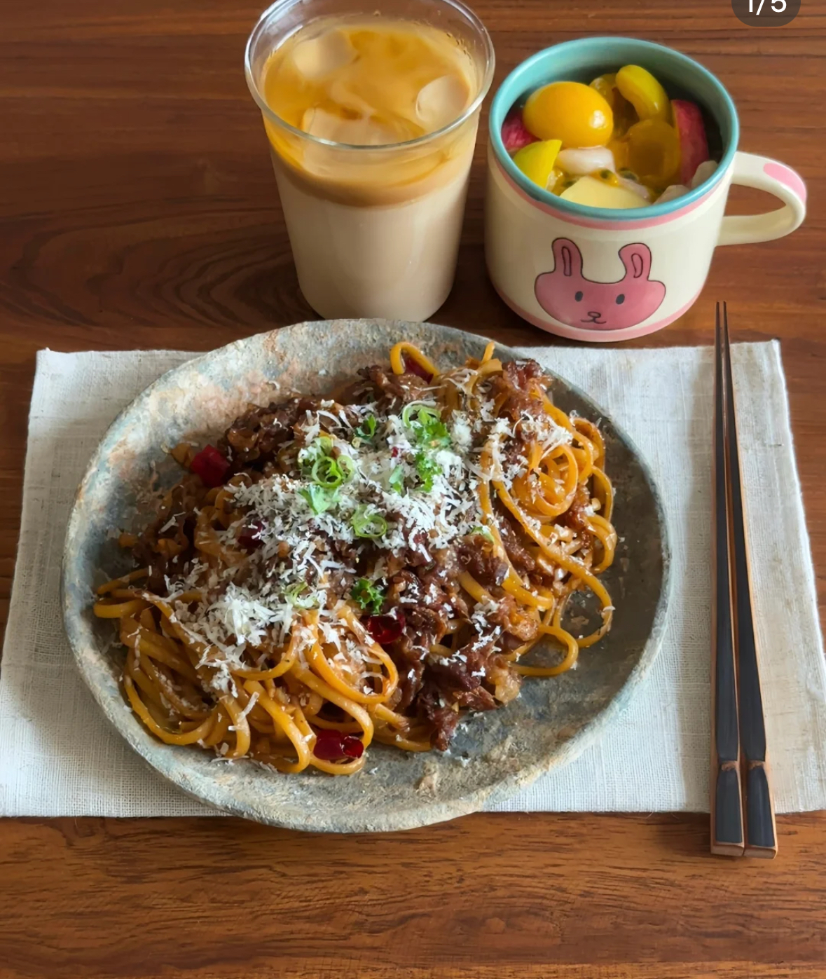Pasta with Meat Sauce | ["pasta","ground meat","cheese","green onions","sauce"] | ["pasta:300g","meat:100g","cheese:30g"] | |