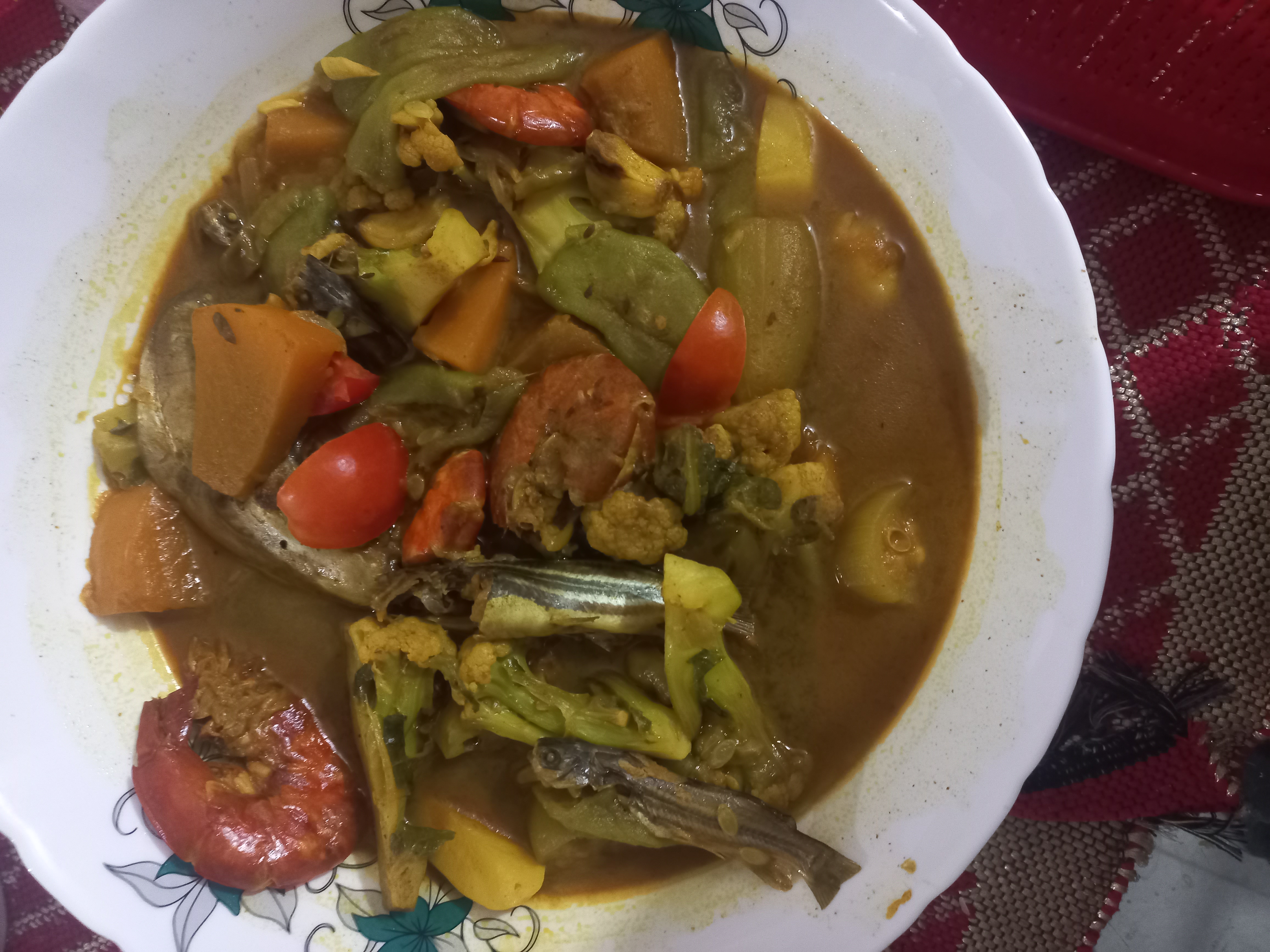 Vegetable and Fish Stew | ["fish","pumpkin","tomatoes","broccoli","cauliflower","green beans"] | ["fish:200g","vegetables:150g"] | |