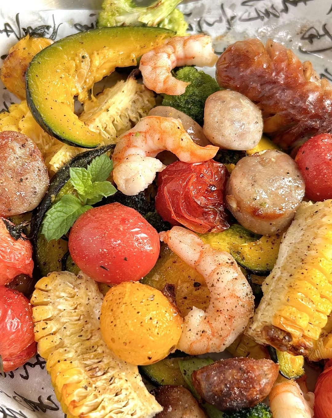 Grilled Vegetable and Shrimp Medley | ["shrimp","zucchini","corn","tomatoes","sausage","broccoli"] | ["shrimp:150g","vegetables:300g"] | |