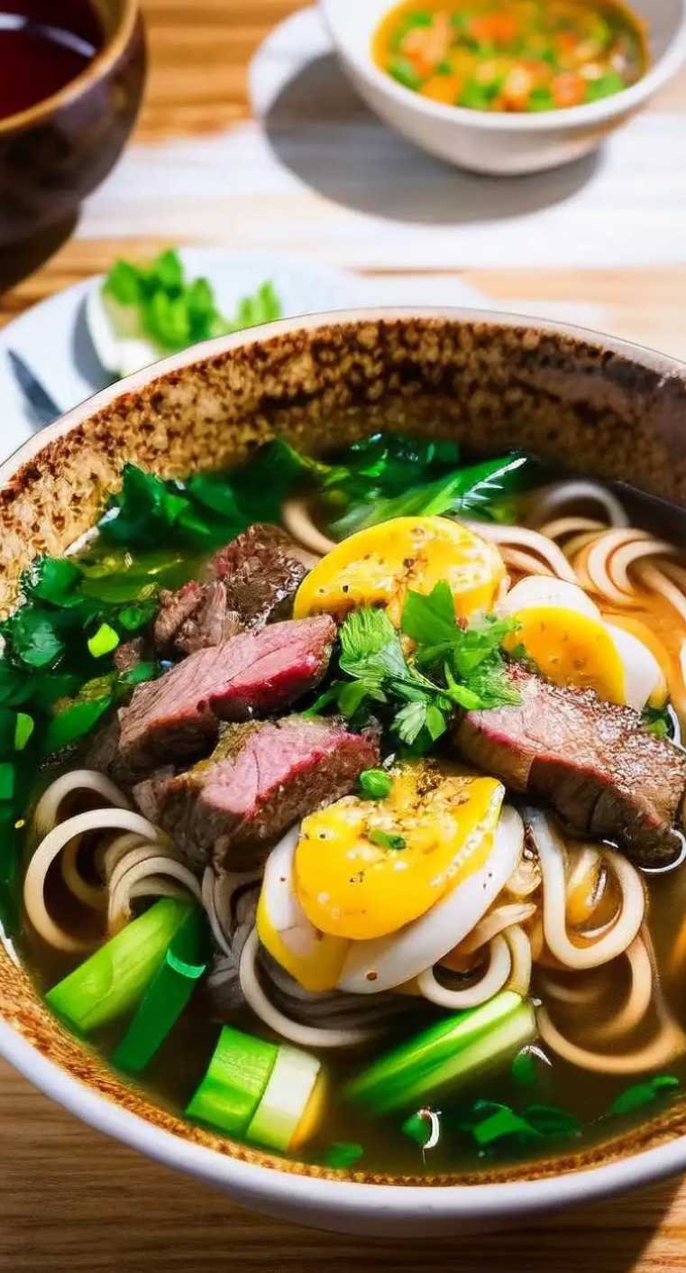 Beef Noodle Soup | ["noodles","beef","egg","green onions","broth"] | ["noodles:200g","beef:150g","egg:50g","vegetables:100g"] | |