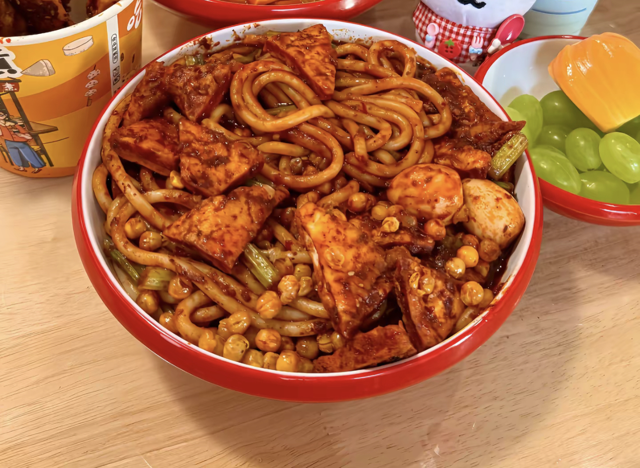 Spicy Noodles with Tofu | ["noodles","tofu","spices","vegetables"] | ["noodles:300g","tofu:100g","vegetables:50g"] | |