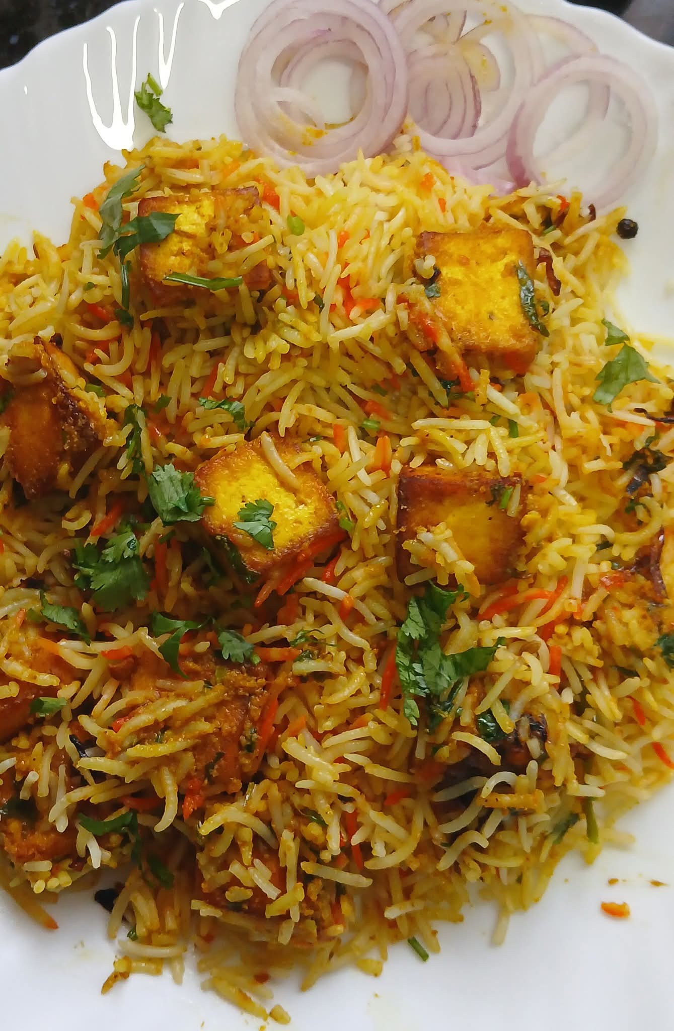 Paneer Biryani | ["rice","paneer","carrots","cilantro","onions","spices"] | ["rice:300g","paneer:100g","vegetables:50g"] | |