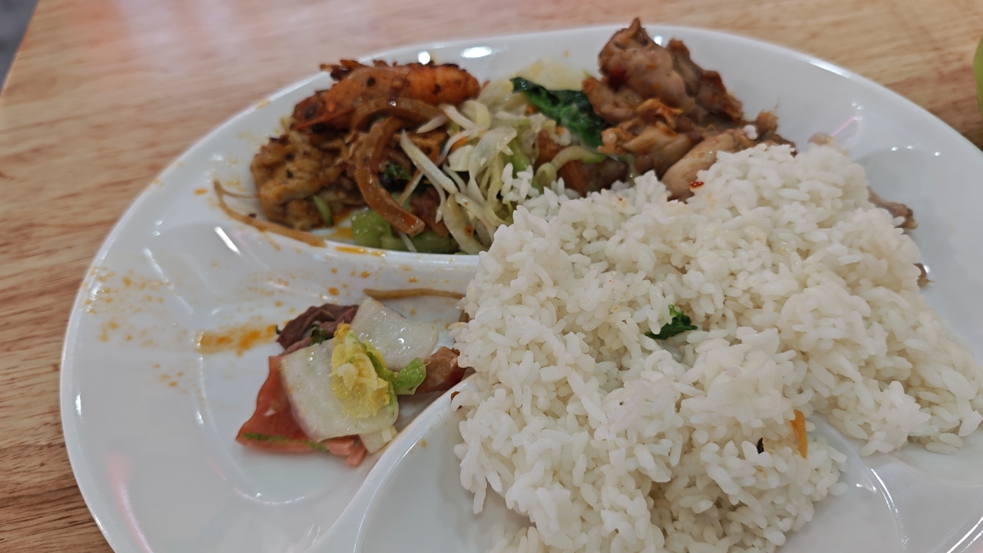 Mixed Plate with Rice | ["rice","chicken","shrimp","cabbage","green peppers"] | ["rice:300g","mixed meat:200g","vegetables:100g"] | |