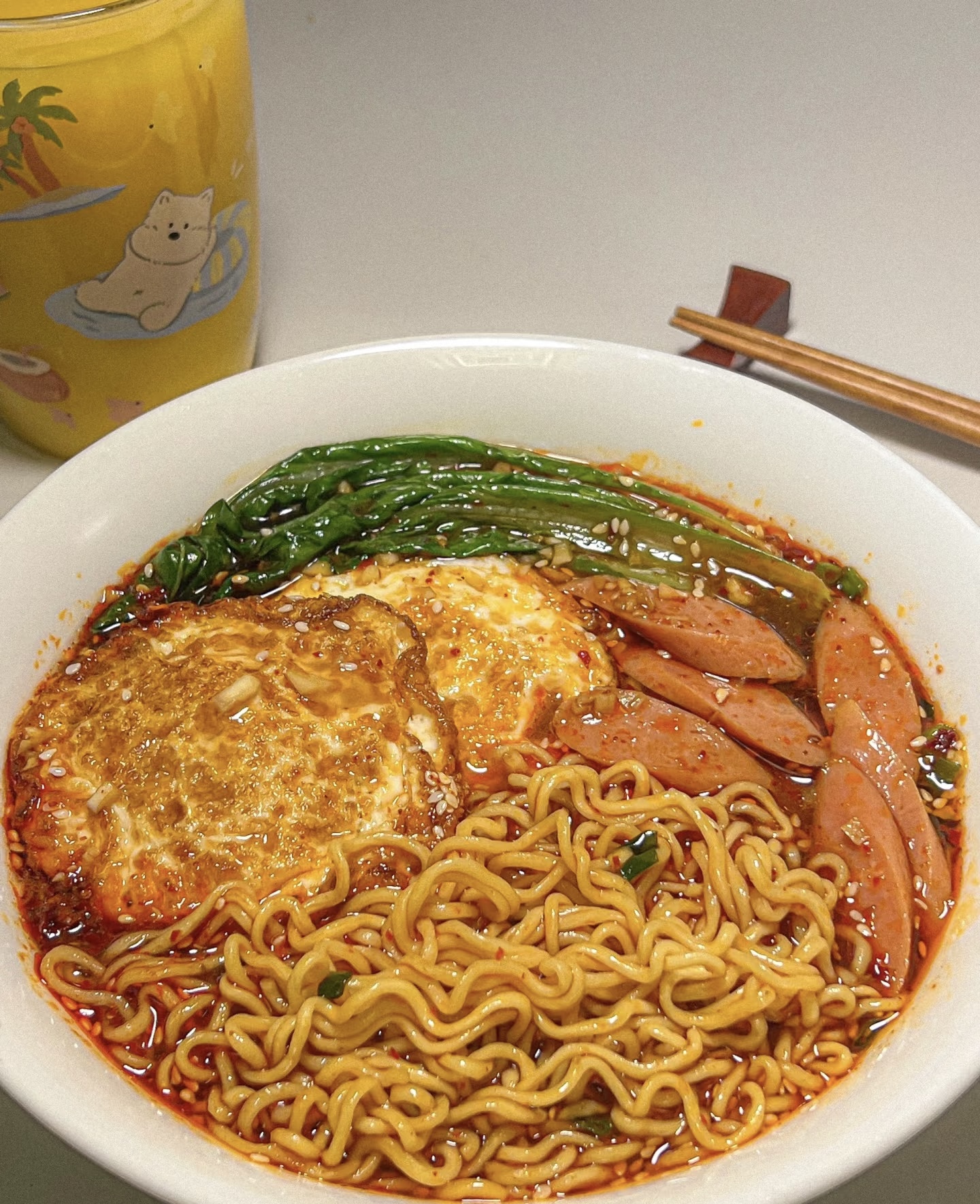 Spicy Instant Noodles | ["noodles","spicy sauce","vegetables"] | ["noodles:100g","sauce:30g"] | |